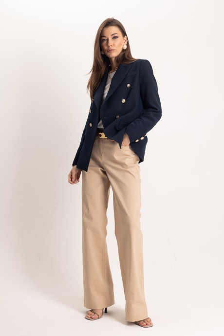 Темно-синий двубортный жакет с яркими золотыми пуговицами выстраивает безупречный четкий силуэт. Внутренние плотные вставки формируют строгую линию плеч, а правильно расставленные вытачки очерчивают талию. В меру плотная эластичная поливискоза делает крой выразительным и одновременно позволяет модели не стеснять движения. Жакет идеально сочетается с джинсами из хлопка. прямого кроя, что обеспечивает свободу движений и комфорт в повседневной жизни. Песочно-бежевый цвет добавляет стиль и универсальности, позволяя легко сочетать эти джинсы с монохромным цветом бомбера. Модель брюк имеет четыре кармана, что делает их функциональными и практичными. Комплект идеальный выбор для делового или повседневного аутфита.