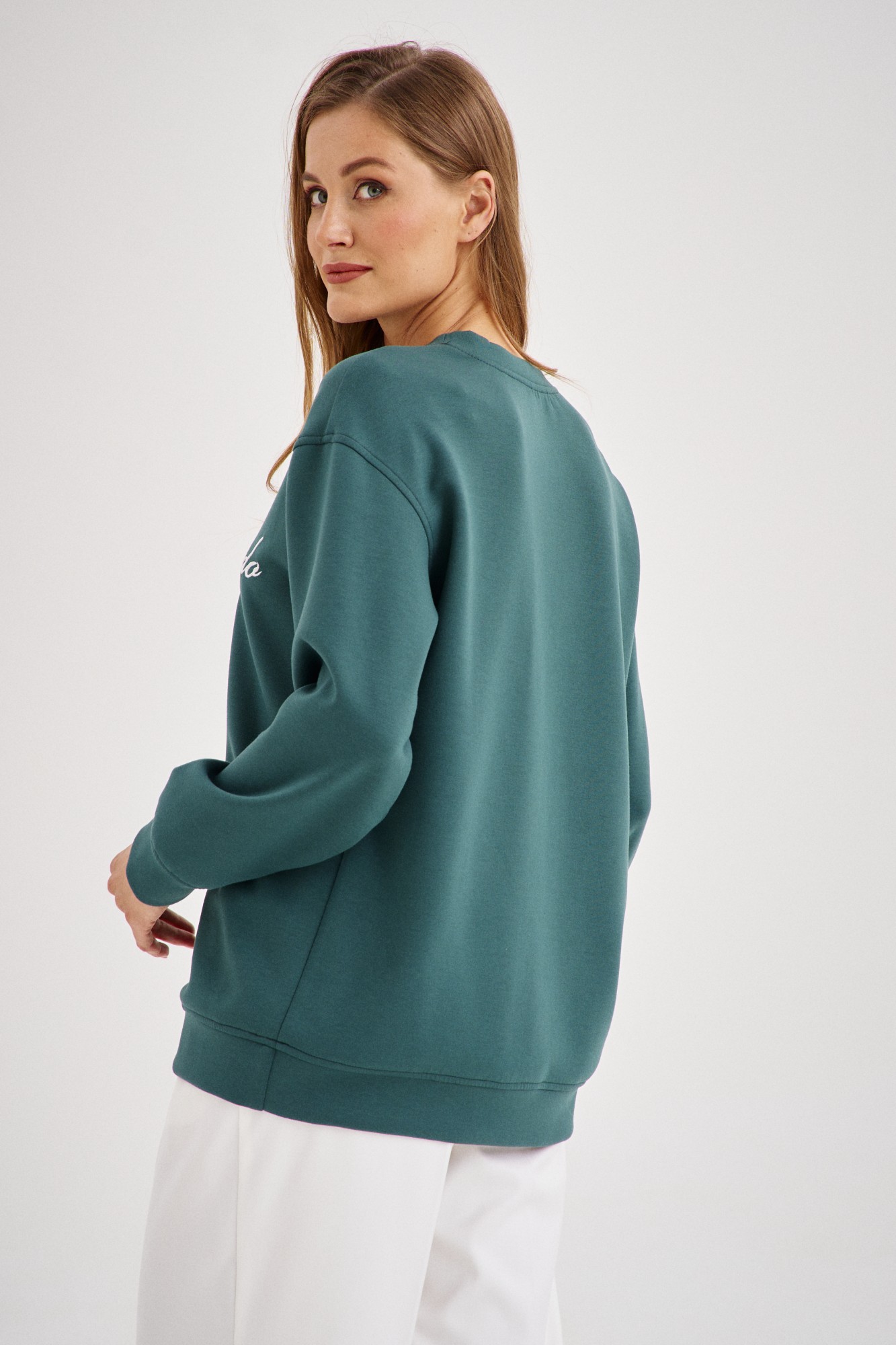 Комплект: глубоко-зеленый (петрол) свитшот с надписью молочного цвета и прямые брюки палаццо. Свитшот выполнен из плотной трикотажной ткани, без застежек и карманов, свободного покроя. Трендовый алый цвет и надпись классического стиля создают данный свитшот стильным элементом гардероба в стиле "Old money". Свитшот идеально сочетается с брюками. Классические брюки-палаццо прямого кроя с высоким поясом, скрытой застежкой-молнией и боковыми карманами выполнены из натуральной поливискозы. Комплект - универсальный элемент женского гардероба, для разных случаев - от спортивных мероприятий до повседневного ношения и бизнес-образов. В брюках размером 48, 50, на участке пояса, по спинке, от шлёвки до шлёвки вставлена резинка.
