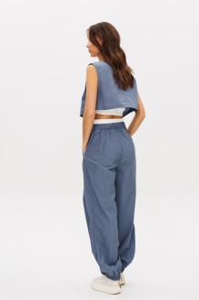 Брючный комплект в неформальном стиле… В текущем сезоне он на пике популярности у модных инфлюэнсеров. Необычные ткани, Мягкие линии кроя, трендовые детали, т.е. все, что непривычно видеть в обычном костюме и всё, что обеспечивает образу игривый «характер». Великолепная тройка, где каждая вещь самодостаточна, но в комплекте дополняет и поддерживает друг друга. Жилет свободный упрямлённый, с круглой горловиной, застёжка на тесьму-молнию, по низу кулиса с эластичной тесьмой и фиксаторами. Длина жилета около 35 см. Брюки в свободном, расслабленном стиле, на эластичном поясе с прорезными карманами на молнии. Пояс с дополнительным эластичным поясом из трикотажного кашкорсе. Длина брюк около 102 см. Майка-топ из трикотажного кашкорсе, с поясом с лёгкой обтяжкой по низу. Длина майки около 30 см.