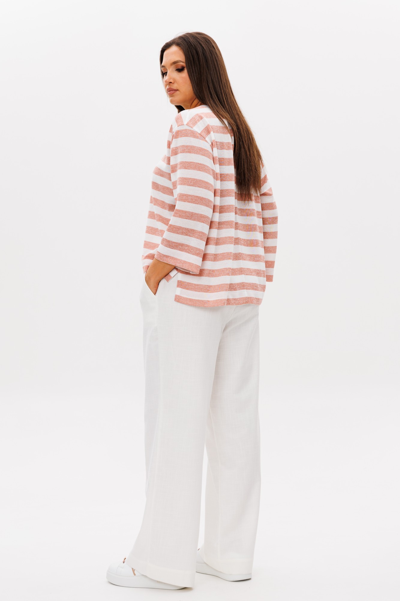 Костюм брючный 2-х предметный. Воплотить уникальный образ на основе базовых вещей оказывается не так уж и сложно. Идеальное сочетание и пропорции-трикотажный джемпер в полоску и белые брюки с акцентной металлической фурнитурой. Такой комплект вы можете миксовать по собственному вкусу, дополняя уже имеющиеся в гардеробе вещи. Свободный, расширенный силуэт, рубашечный покрой, рукав расширенный в области оката. По горловине отделочная тесьма-довяз. Брюки из смесовой льняной ткани, свободного покроя, на притачном поясе, эластичном в области спинки и частично переда. Передние половинки брюк с оригинальной застежкой, центральным швом и наклонными боковыми карманами.