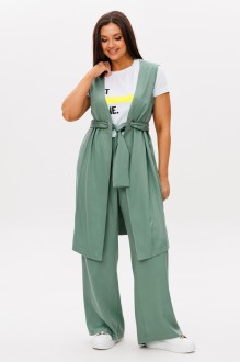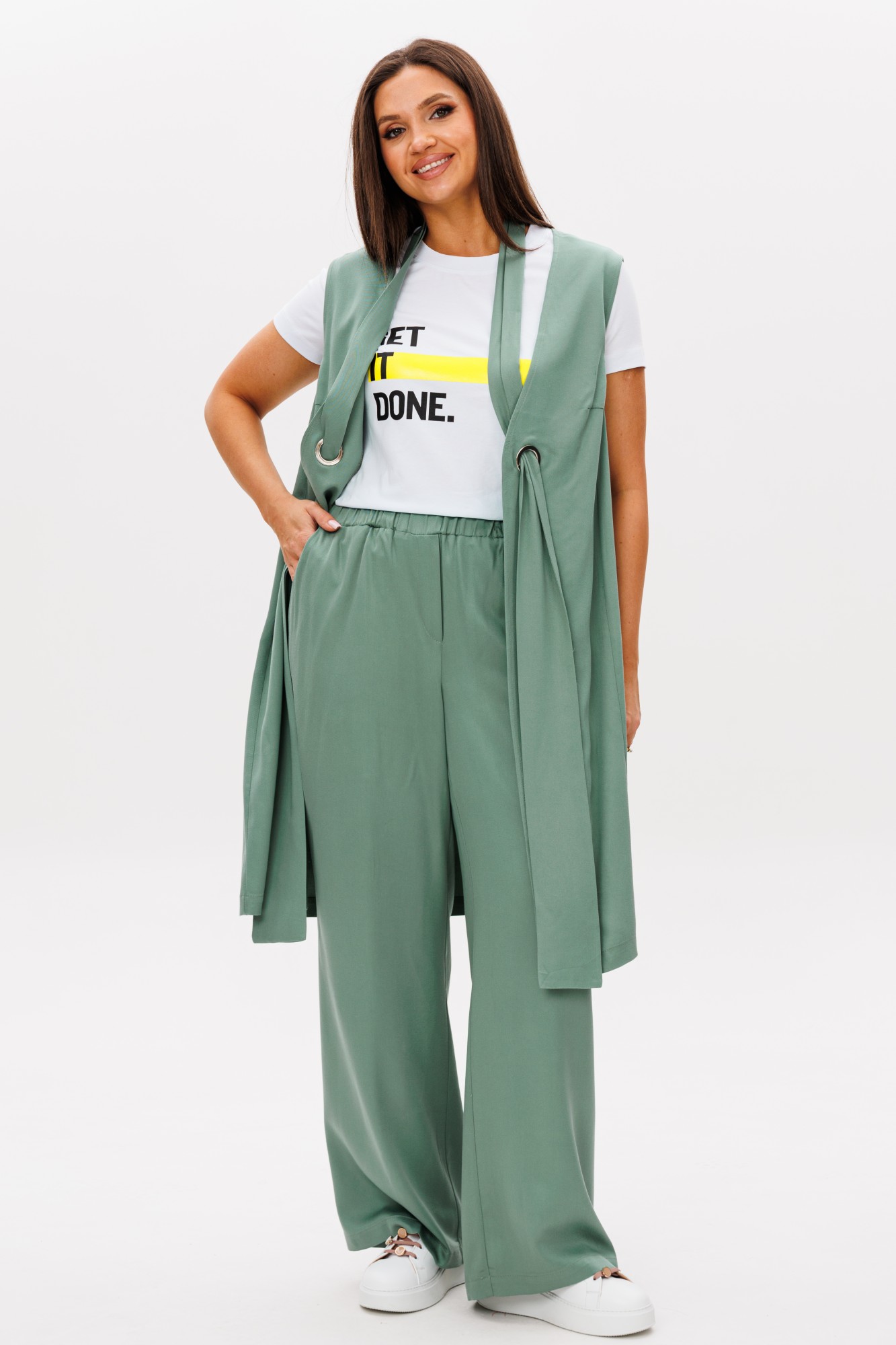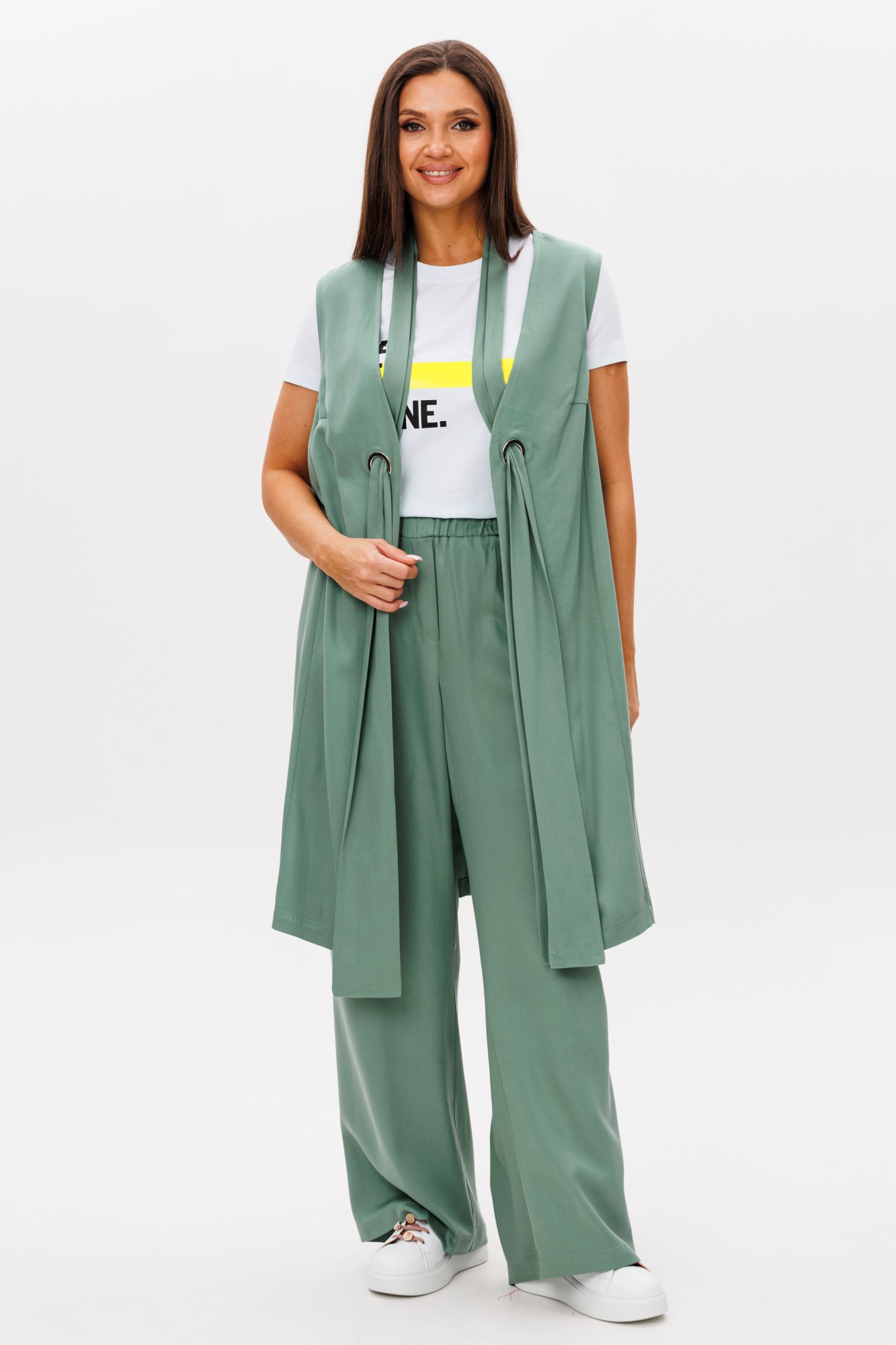 Комплекты в стиле кэжуал выбирает не только молодёжь: девушки в элегантном возрасте тоже ценят его за комфорт и индивидуальную свободу при создании своего образа. Уникальный симбиоз удобства и привлекательности. Свободный удлинённый жилет и комфортные брюки в расслабленном стиле. Жилет А-силуэта, без застёжки, с декоративными люверсами и отделочным шарфом. Полочка с боковым рельефом и нагрудной вытачкой. Спинка со средним швом и боковым рельефом. Брюки свободные, на эластичном поясе, с наклонными боковыми карманами.
