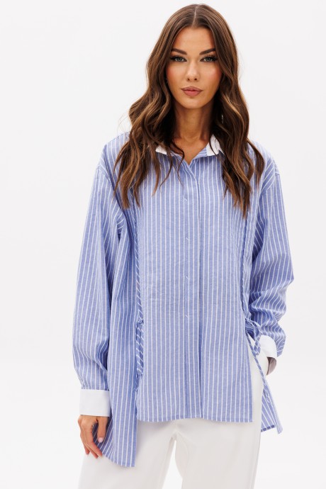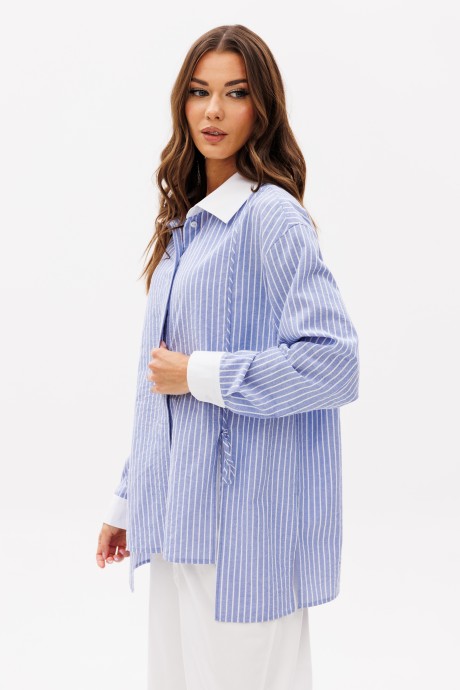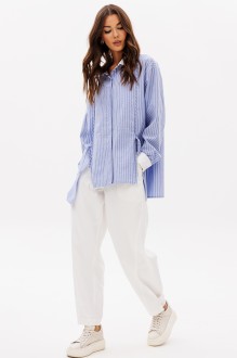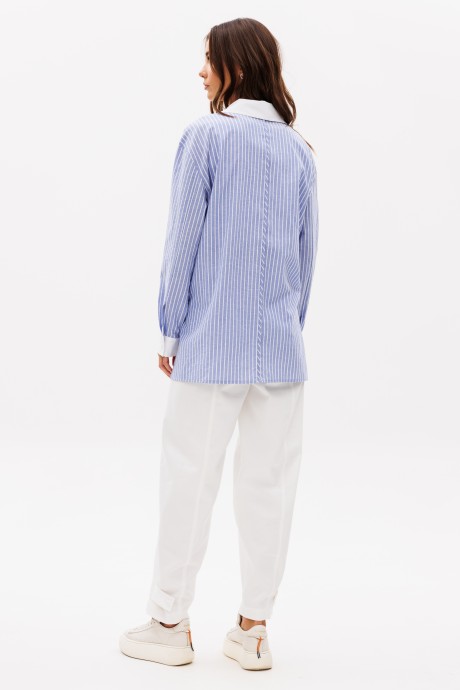 Рубашка в полоску никогда не относилась к категории трендов. Это вневременная база, которая всегда есть в гардеробе у модницы. Однако этим летом полосатая рубашка переживает новый виток популярности, а в паре с белыми джинсовыми брюками она просто незаменима для создания модных летних образов. Свободный расширенный силуэт, рубашечный покрой, потайная застежка на петли и пуговицы, рубашечный рукав и воротник. Полочка с вертикальными рельефами, разрезом и отделкой под углом 45 градусов. Спинка с центральным швом с отделкой из тесьмы под углом 45 градусов. Низ изделия - разноуровневый, центральная часть полочки укороченная. Рукав рубашечный, с притачной манжетой. Манжета рукава и воротник из отделочной ткани. Длина рукава с плечом около 74 см. Брюки покроя ""barrel"", расширенные в области икры и зауженные к низу. Пояс притачной, эластичный в области спинки. По передним половинкам брюк-застежка и боковой наклонный карман. По задним-вертикальный шов. Боковой шов смещен в сторону центра передних половинок брюк. По низу-пата с регулирующими пуговицами, позволяющая создавать разную ширину брюк внизу.