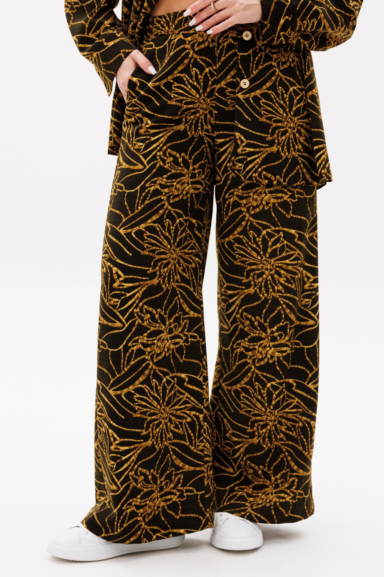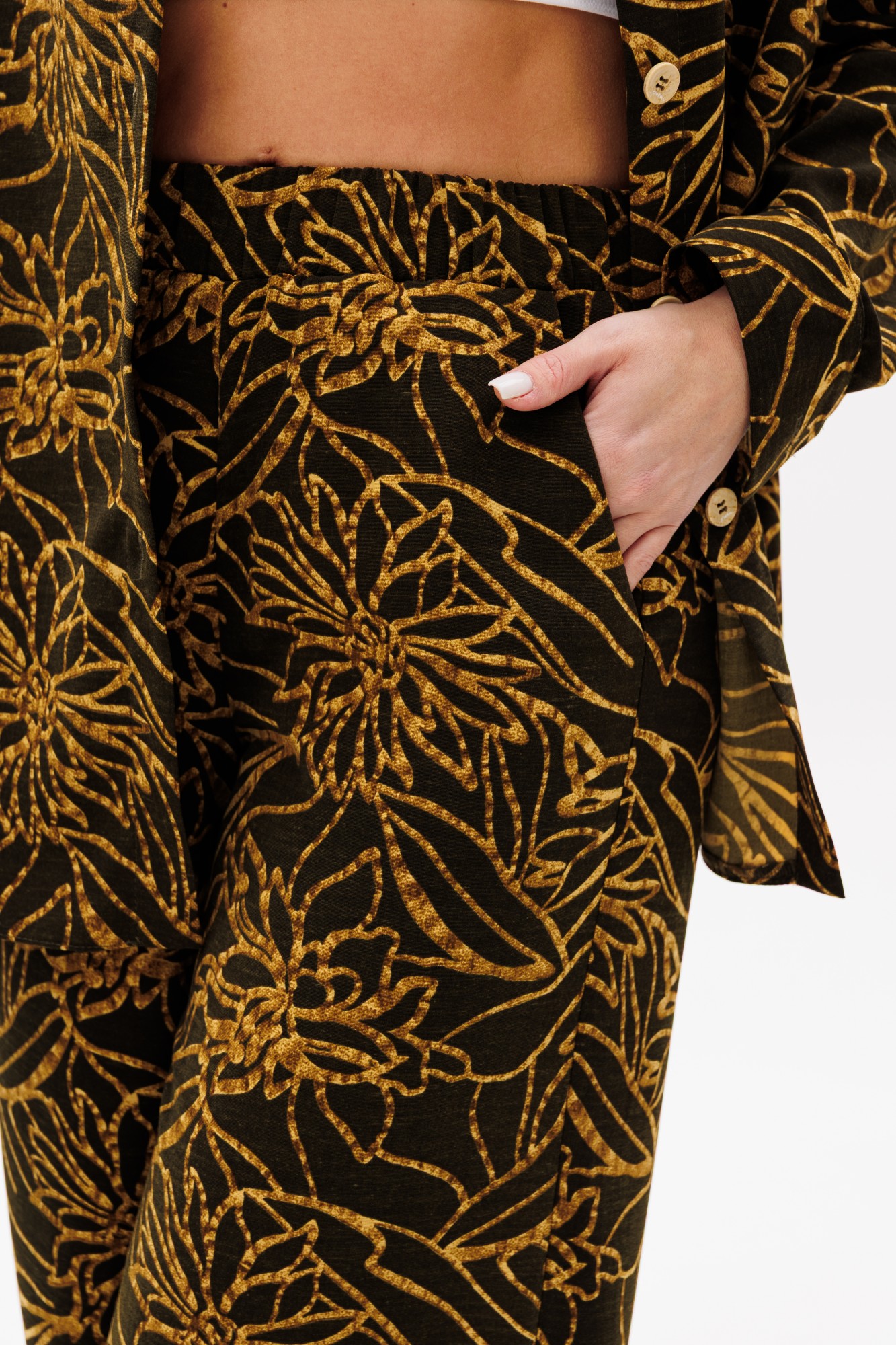 Брючный костюм, который с лёгкостью становится нарядным! Прежде всего, его выделяет роскошная ткань с геометрическим крупным рисунком, которая позволяет создать такой великолепный вариант брючного комплекта, который составит конкуренцию любому платью. Прямые линии, минимум декоративных элементов этот костюм как чистый лист, позволяет при помощи аксессуаров создать свои, неповторимые сеты. Свободная широкая рубашка и брюки-палаццо. Силуэт оверсайз, покрой рубашечный, воротник классический рубашечный с отрезной стойкой. Полоска, с отрезной кокеткой и накладным карманом. Спинка с отрезной кокеткой. Рукав с отрезной манжетой. Брюки на приточном поясе, эластичном в области спинки, с наклонными боковыми карманами.
