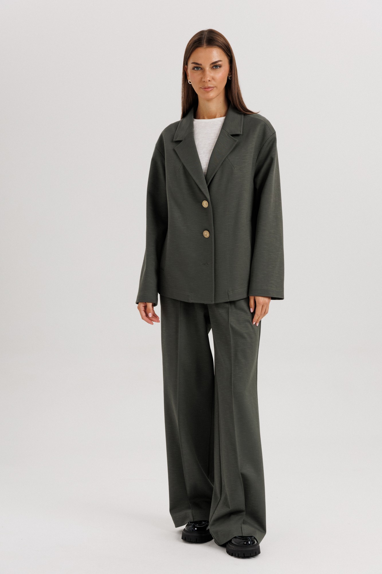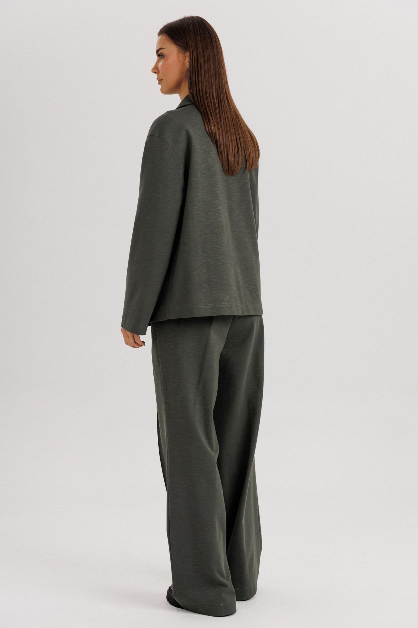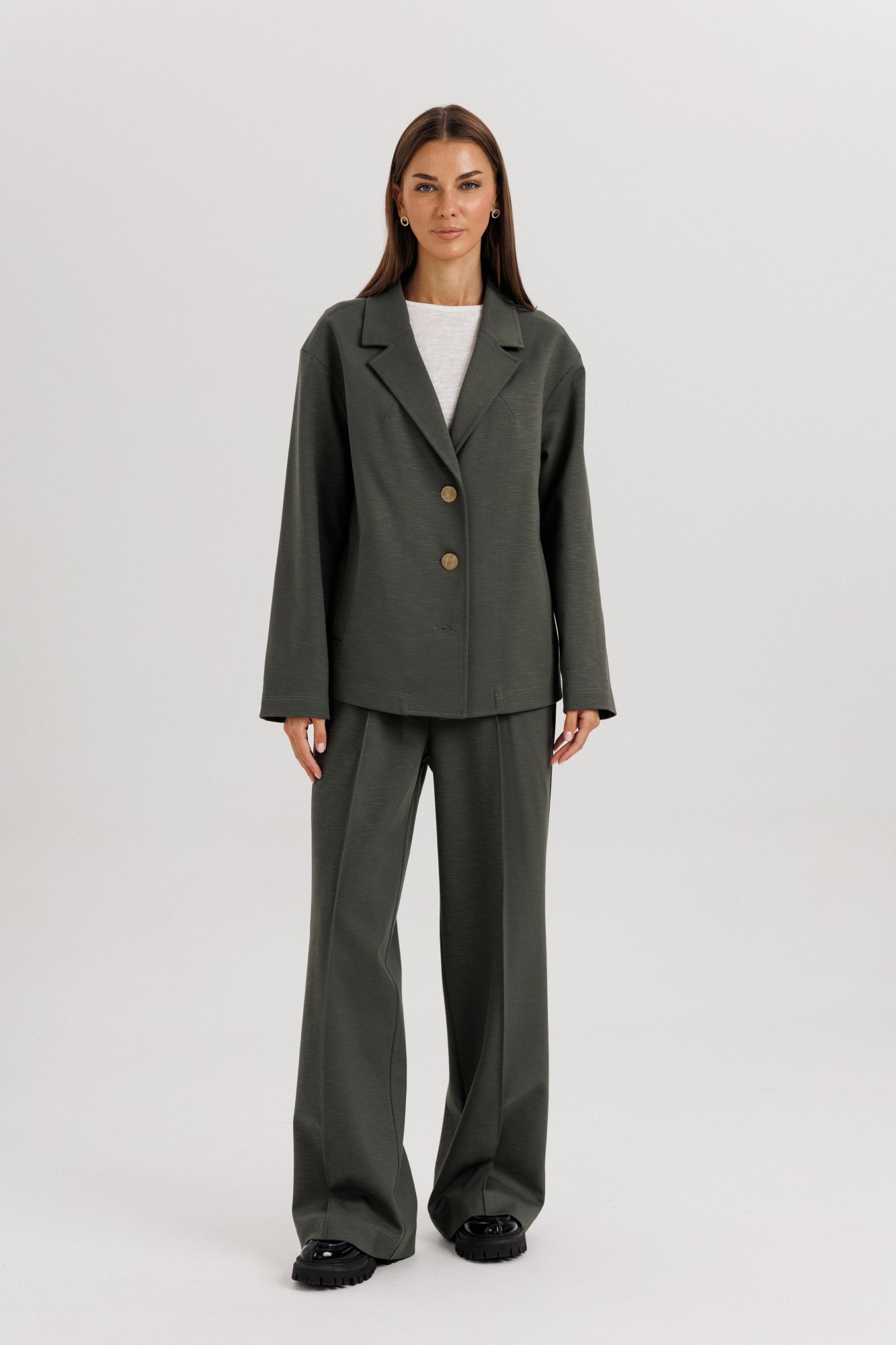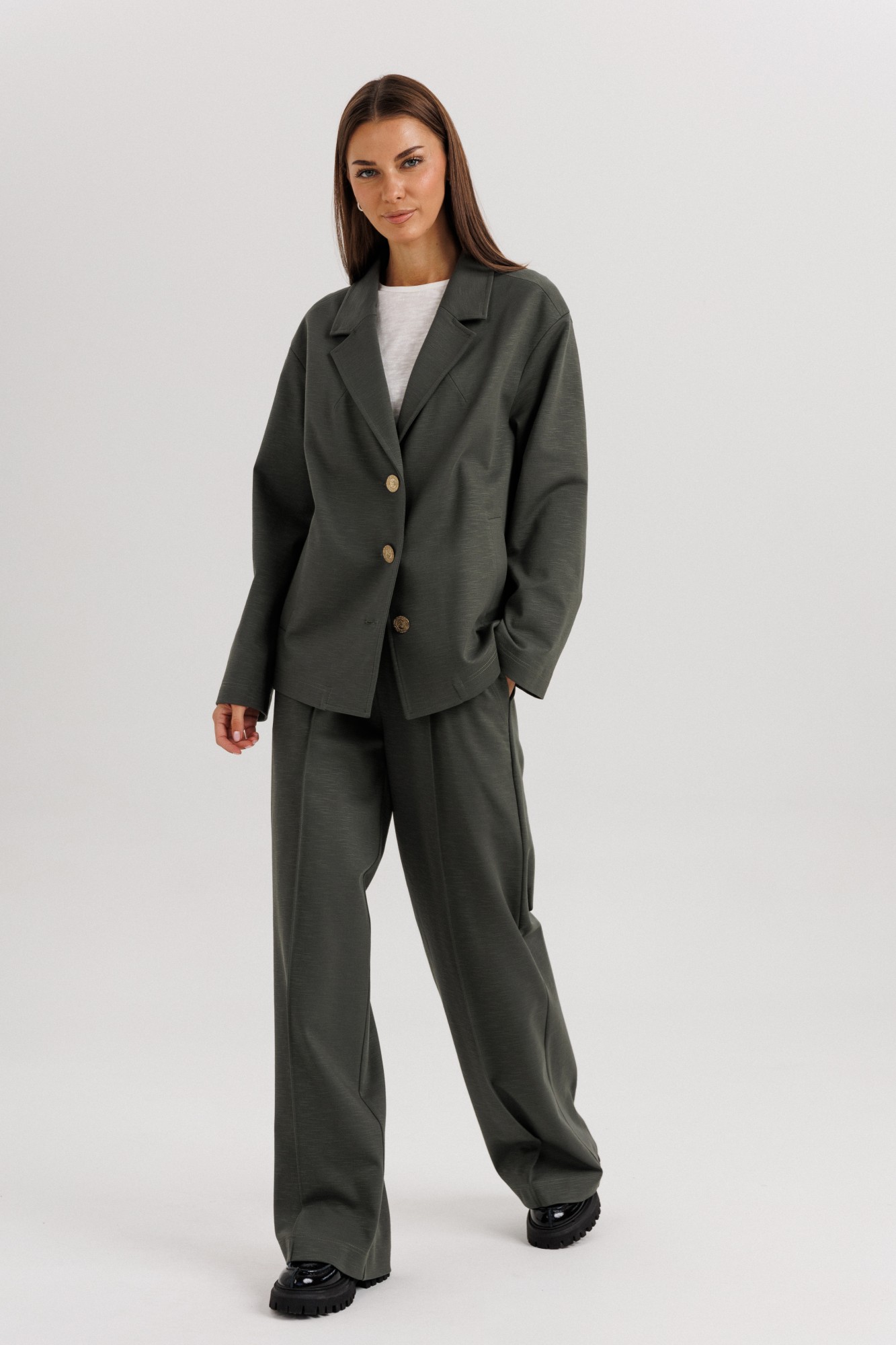 Элегантный женский брючный костюм свободного кроя — стильное решение для современных девушек, ценящих комфорт и универсальность. Классический дизайн и лаконичный силуэт делают его отличным выбором как для офиса, так и для повседневных выходов. Жакет: Свободный прямой крой, длина до линии бедер. Классический английский воротник с лацканами. Застежка на две крупные пуговицы. Длинные прямые рукава. Минималистичный дизайн без нагромождения деталей. Брюки: Свободные, прямые, с расширением к низу. Посадка средняя, комфортная линия талии. Длина удлиненная, прикрывает обувь. Стрелки спереди визуально вытягивают силуэт. Особенности: Лаконичный дизайн, который легко сочетается с базовыми футболками, блузами и обувью. Подходит как для делового стиля, так и для кэжуал образов. Универсальный глубокий оттенок ткани делает костюм практичным и актуальным в любое время года. Костюмная ткань (смесь полиэстера И вискозы — для комфорта и износостойкости). Уход: Ручная или деликатная стирка при 30°C. Не отбеливать. Гладить при низкой температуре.