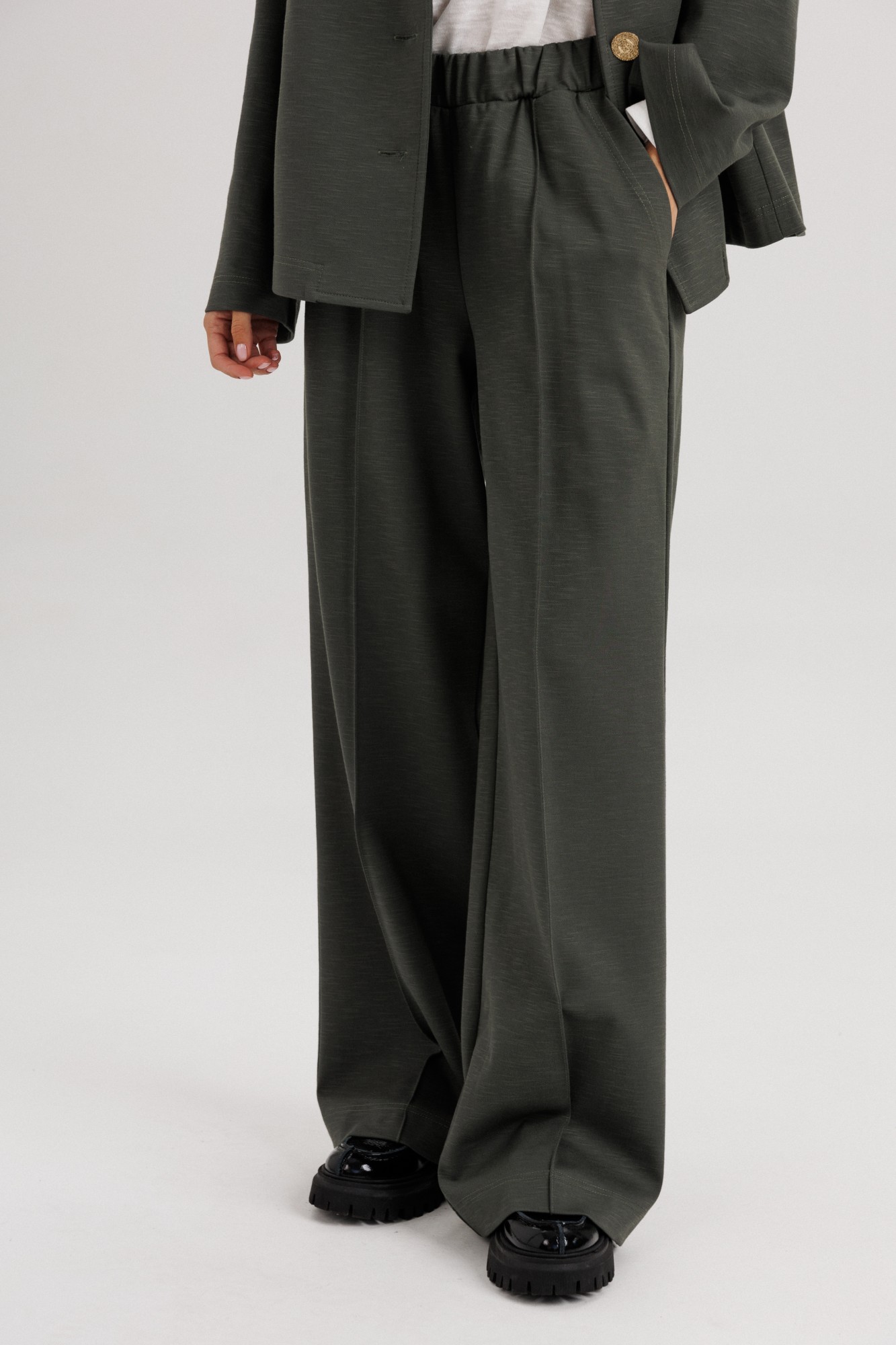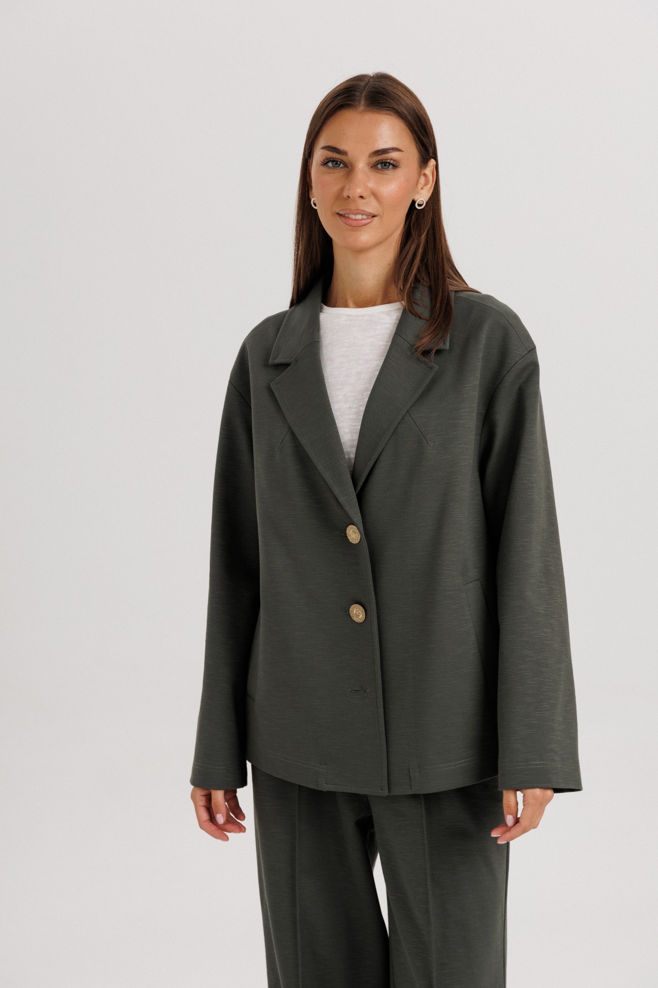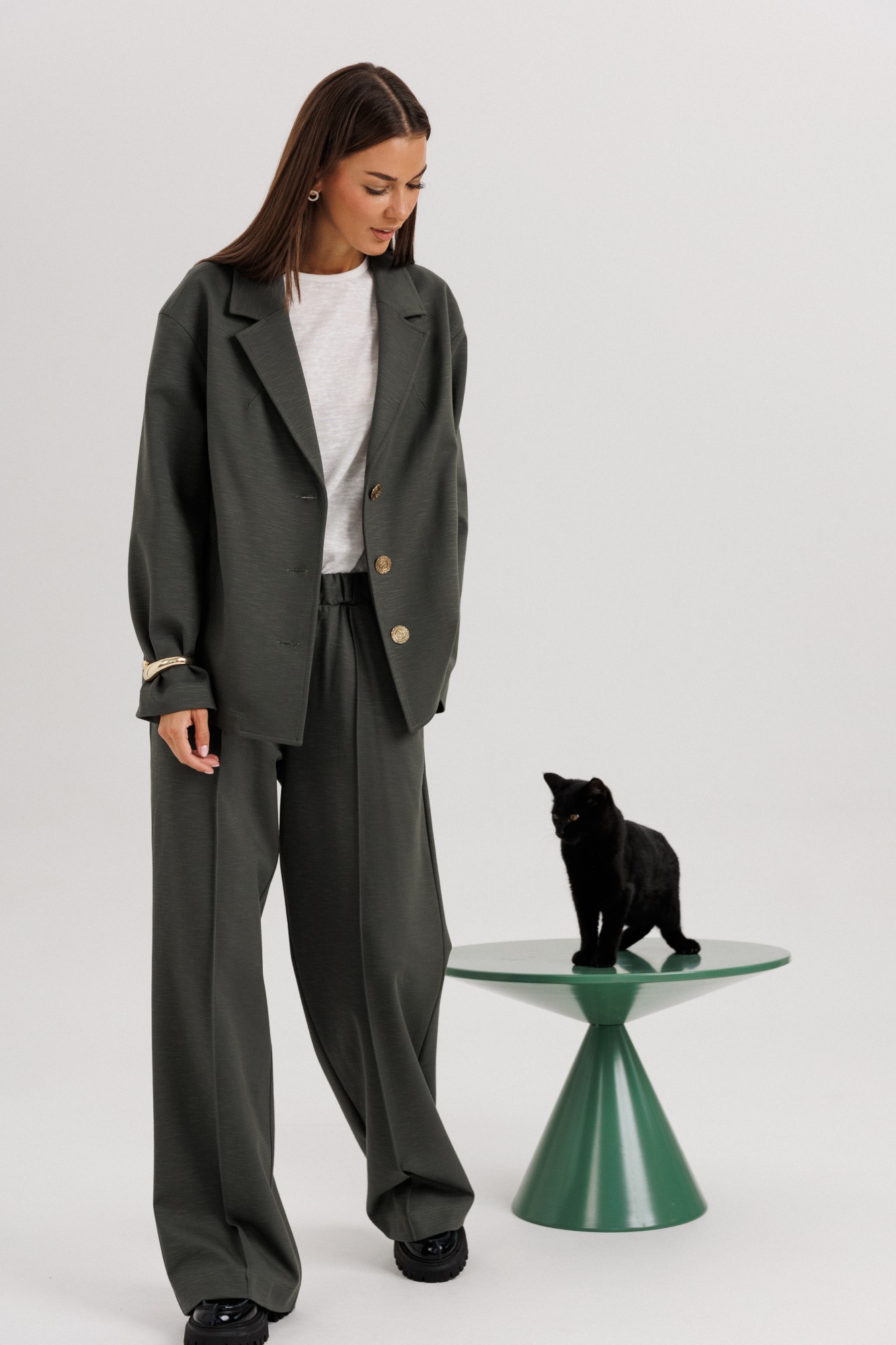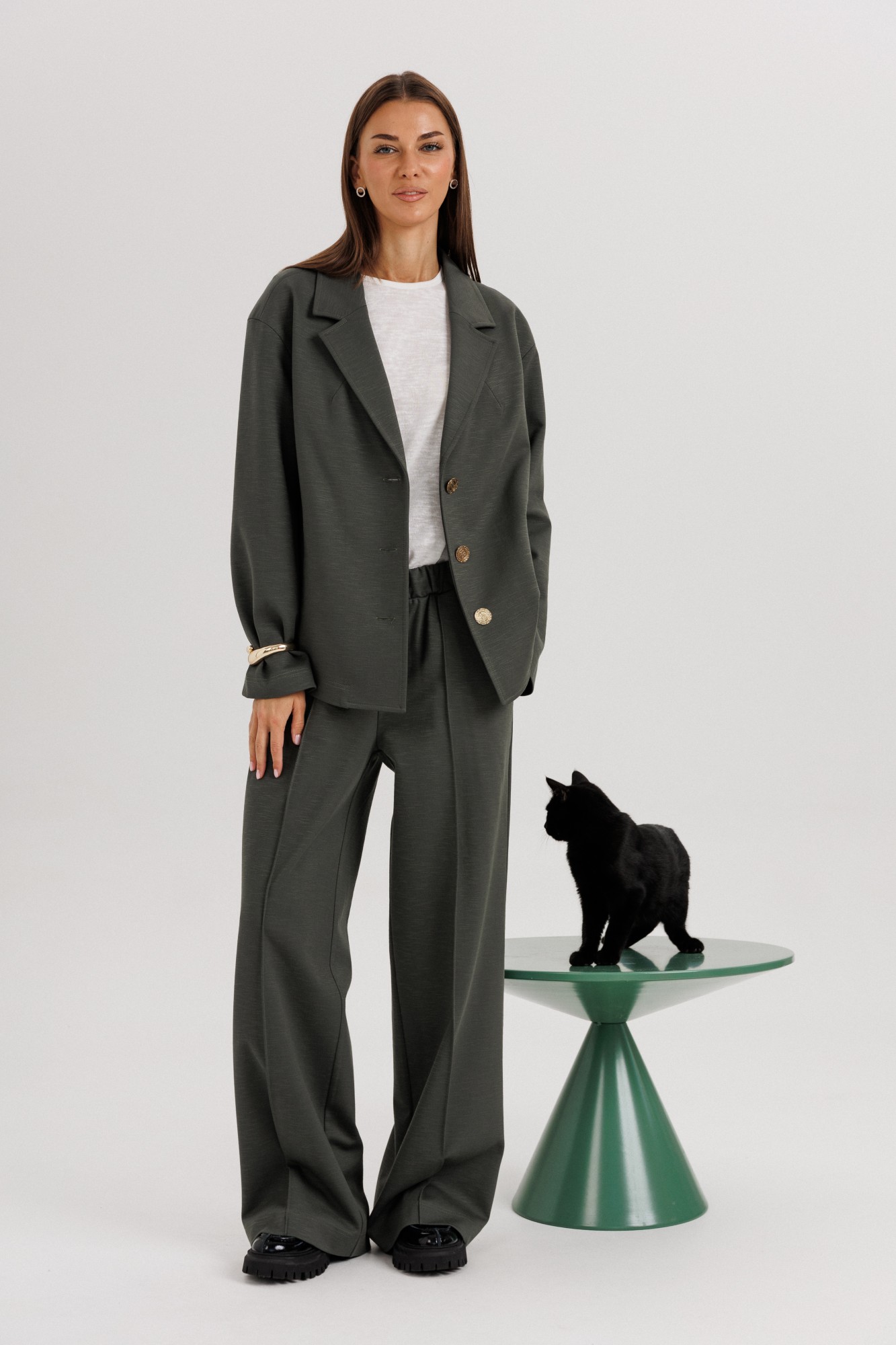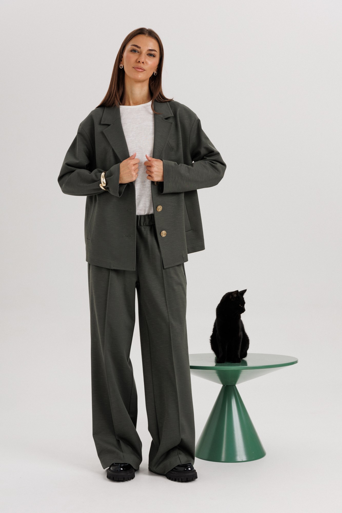 Элегантный женский брючный костюм свободного кроя — стильное решение для современных девушек, ценящих комфорт и универсальность. Классический дизайн и лаконичный силуэт делают его отличным выбором как для офиса, так и для повседневных выходов. Жакет: Свободный прямой крой, длина до линии бедер. Классический английский воротник с лацканами. Застежка на две крупные пуговицы. Длинные прямые рукава. Минималистичный дизайн без нагромождения деталей. Брюки: Свободные, прямые, с расширением к низу. Посадка средняя, комфортная линия талии. Длина удлиненная, прикрывает обувь. Стрелки спереди визуально вытягивают силуэт. Особенности: Лаконичный дизайн, который легко сочетается с базовыми футболками, блузами и обувью. Подходит как для делового стиля, так и для кэжуал образов. Универсальный глубокий оттенок ткани делает костюм практичным и актуальным в любое время года. Костюмная ткань (смесь полиэстера И вискозы — для комфорта и износостойкости). Уход: Ручная или деликатная стирка при 30°C. Не отбеливать. Гладить при низкой температуре.