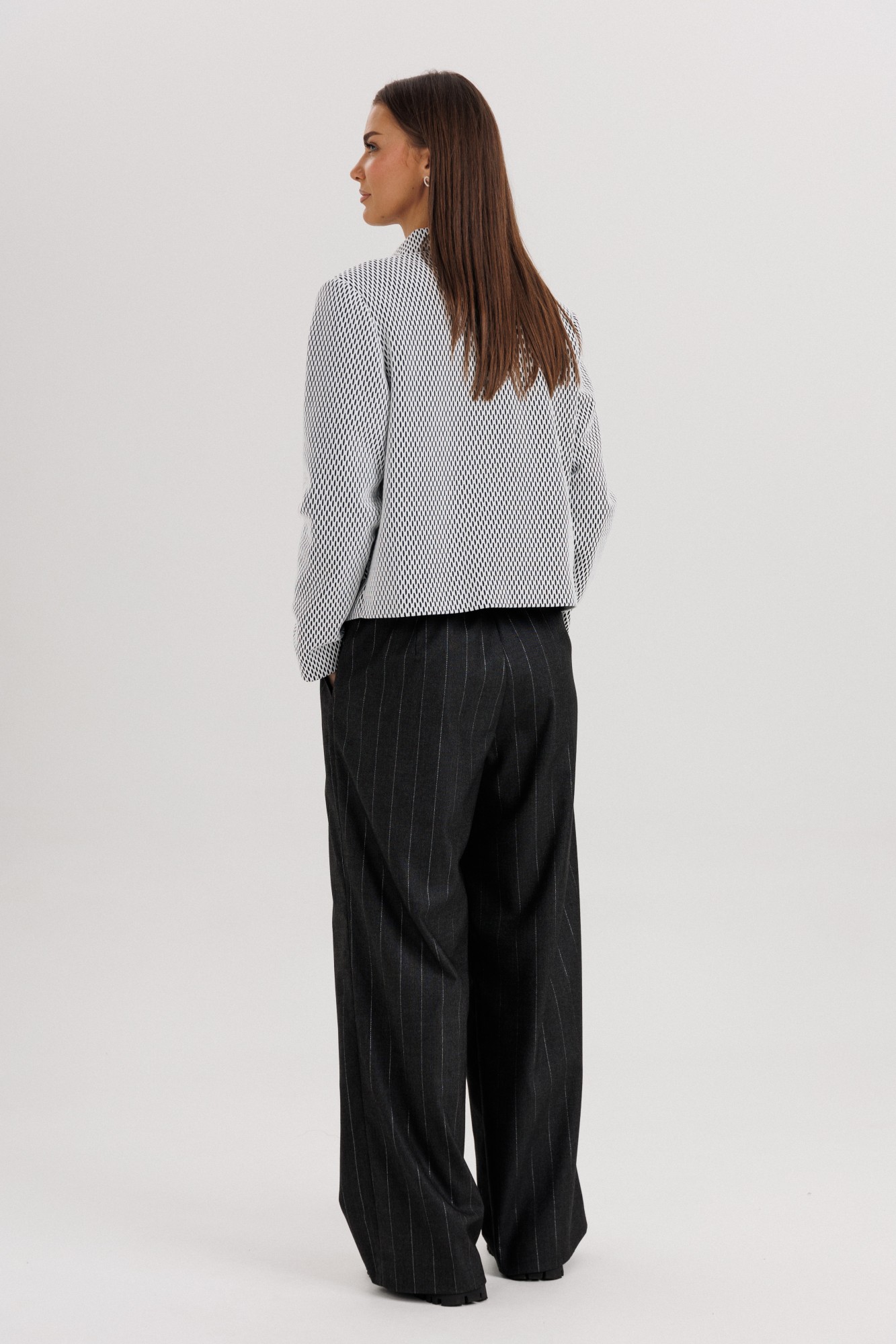 Современный женский костюм в стиле smart casual сочетает элегантность классики и комфорт повседневного образа. Комплект состоит из жакета прямого кроя с крупными пуговицами и брюк в тонкую вертикальную полоску. Контраст текстур придаёт образу динамичность и стиль. Жакет укороченной длины выполнен из лёгкой ткани с графическим узором, имеет отложной воротник и аккуратную застёжку на пуговицы. Брюки прямого силуэта со стрелками и комфортной посадкой по талии визуально вытягивают силуэт и добавляют стройности. Костюм универсален — идеально подходит для офиса, деловых встреч и городских выходов. Его можно сочетать с лофферами, туфлями на каблуке или кроссовками для более расслабленного стиля. Особенности модели: Комплект: жакет + брюки. Стильный контрастный дизайн. Прямой силуэт и длина брюк миди. Классическая полоска — тренд сезона 2025. Удобная посадка и лаконичный крой.