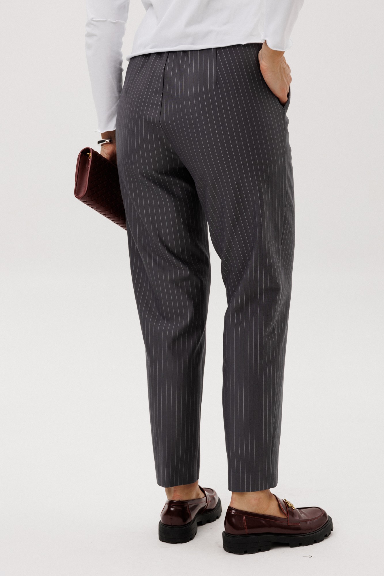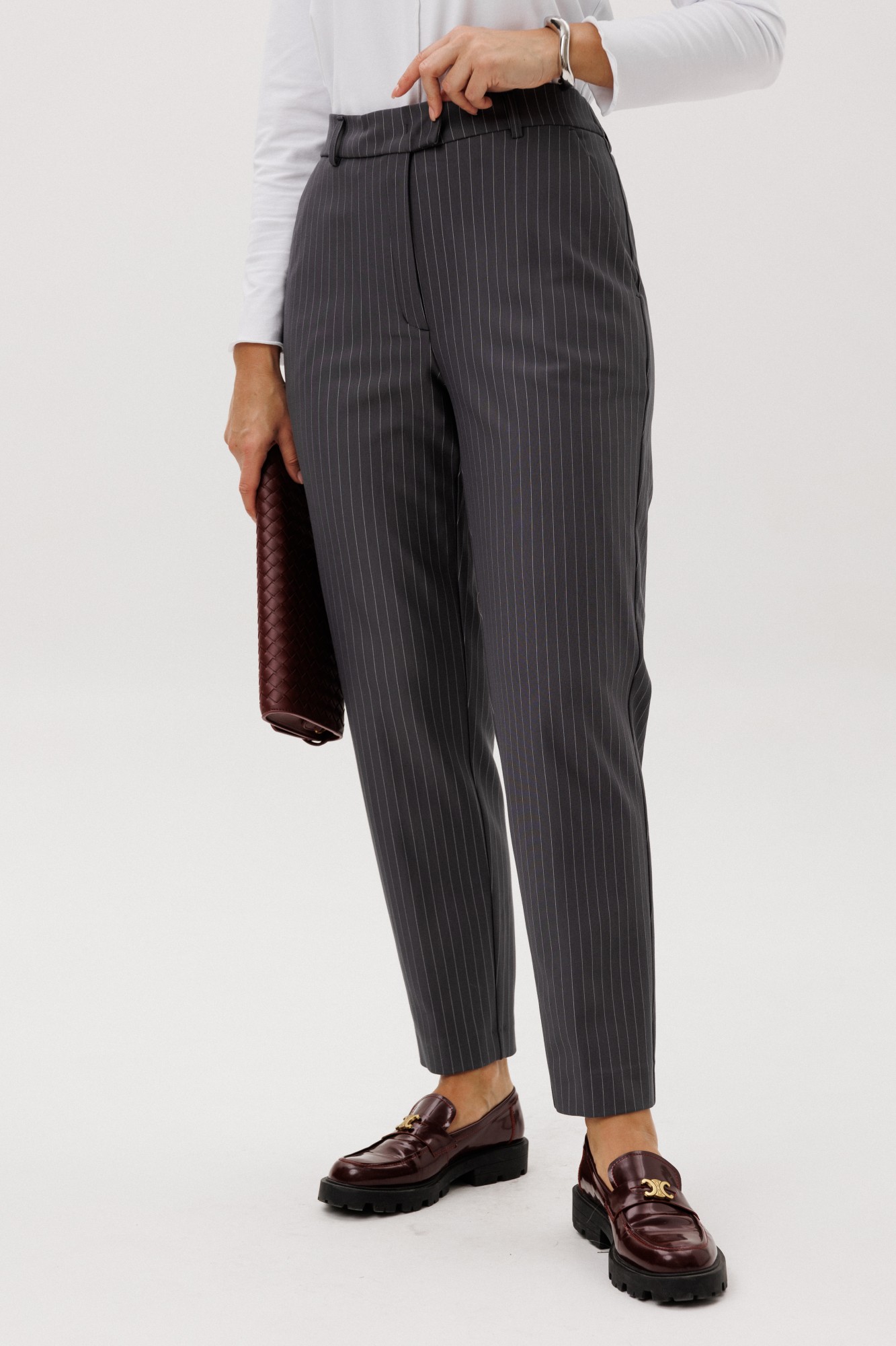 Стильный женский костюм в полоску — идеальное сочетание элегантности и современного минимализма. Комплект состоит из жилета оригинального кроя с асимметричной застёжкой, брюк и джемпера с длинным рукавом. Модель выполнена из плотной трикотажной ткани с тонкой вертикальной полоской, которая визуально вытягивает силуэт и подчёркивает стройность. Жилет без рукавов застёгивается на декоративные пуговицы, создавая выразительный акцент в образе. Брюки классические, прямые. Джемпер трикотажный, с длинным рукавом, полуприлегающего силуэта. Костюм легко комбинируется с базовыми лонгсливами, водолазками или блузками, подходит для офиса, деловых встреч и городских образов.