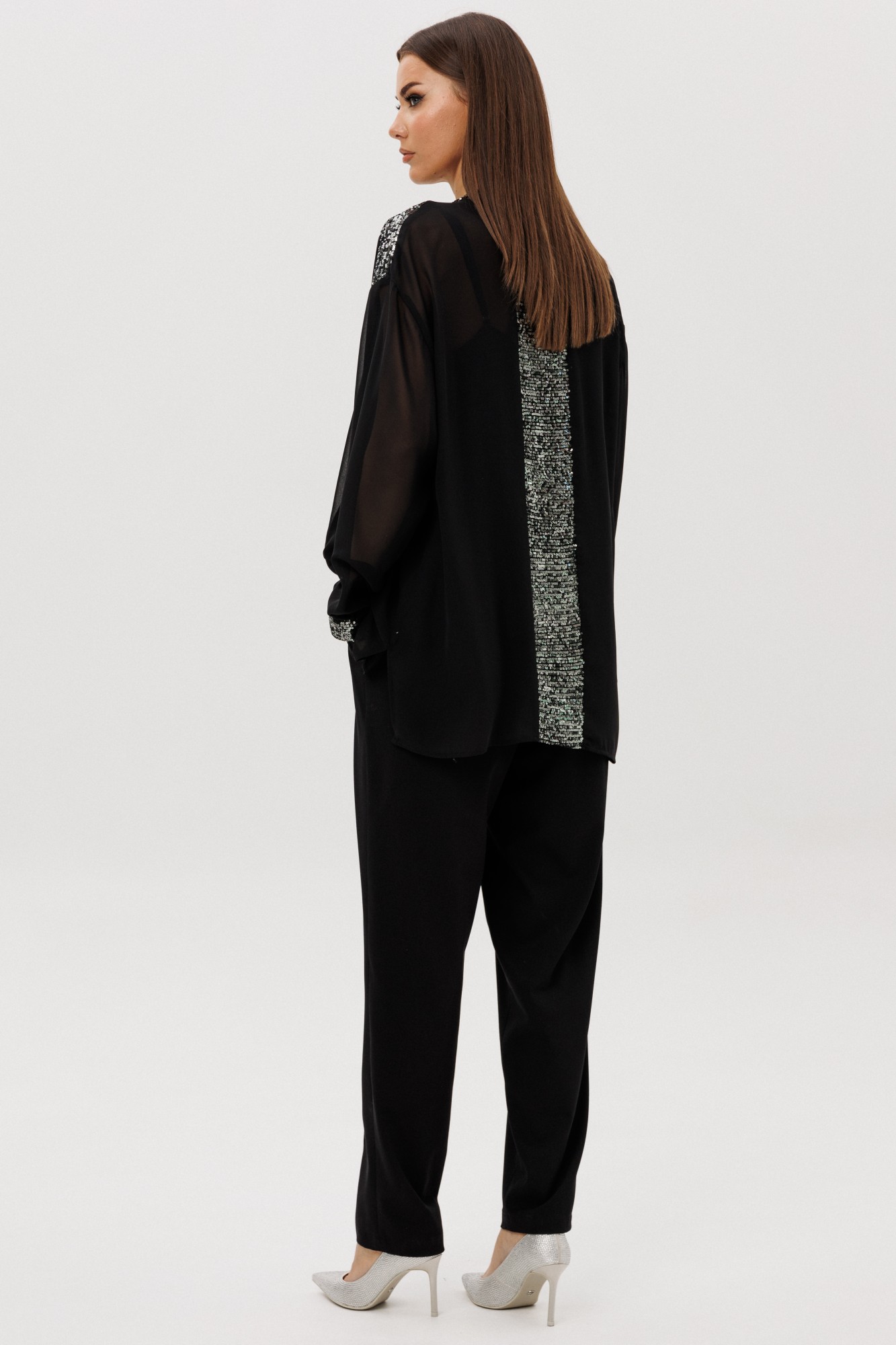 Эффектный брючный комплект-тройка — воплощение современного стиля с ноткой вечерней элегантности. Лёгкая шифоновая блуза свободного покроя украшена изысканной отделкой пайетками по линии борта и манжетам, создавая тонкий блеск и игру света в движении. Атласный топ на регулируемых бретелях добавляет мягкого женственного сияния и комфортно садится по фигуре. Брюки из поливискозного полотна со стрелками и эластичным поясом завершают образ, сочетая удобство и безупречный силуэт. Идеальный выбор для вечернего выхода, праздничного события или стильной городской прогулки — этот костюм легко адаптируется под настроение и аксессуары.