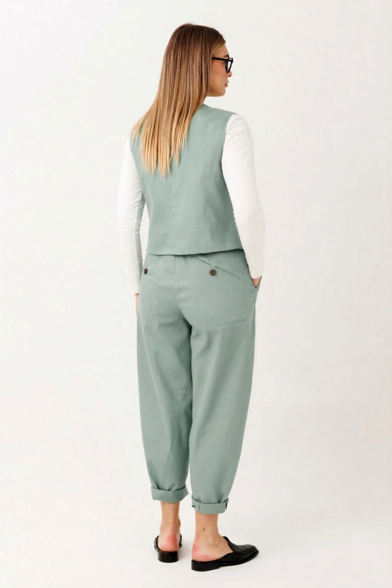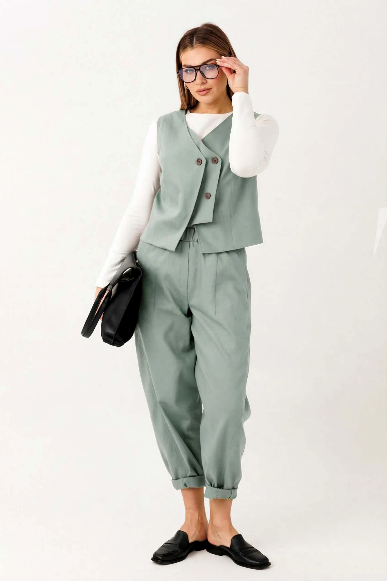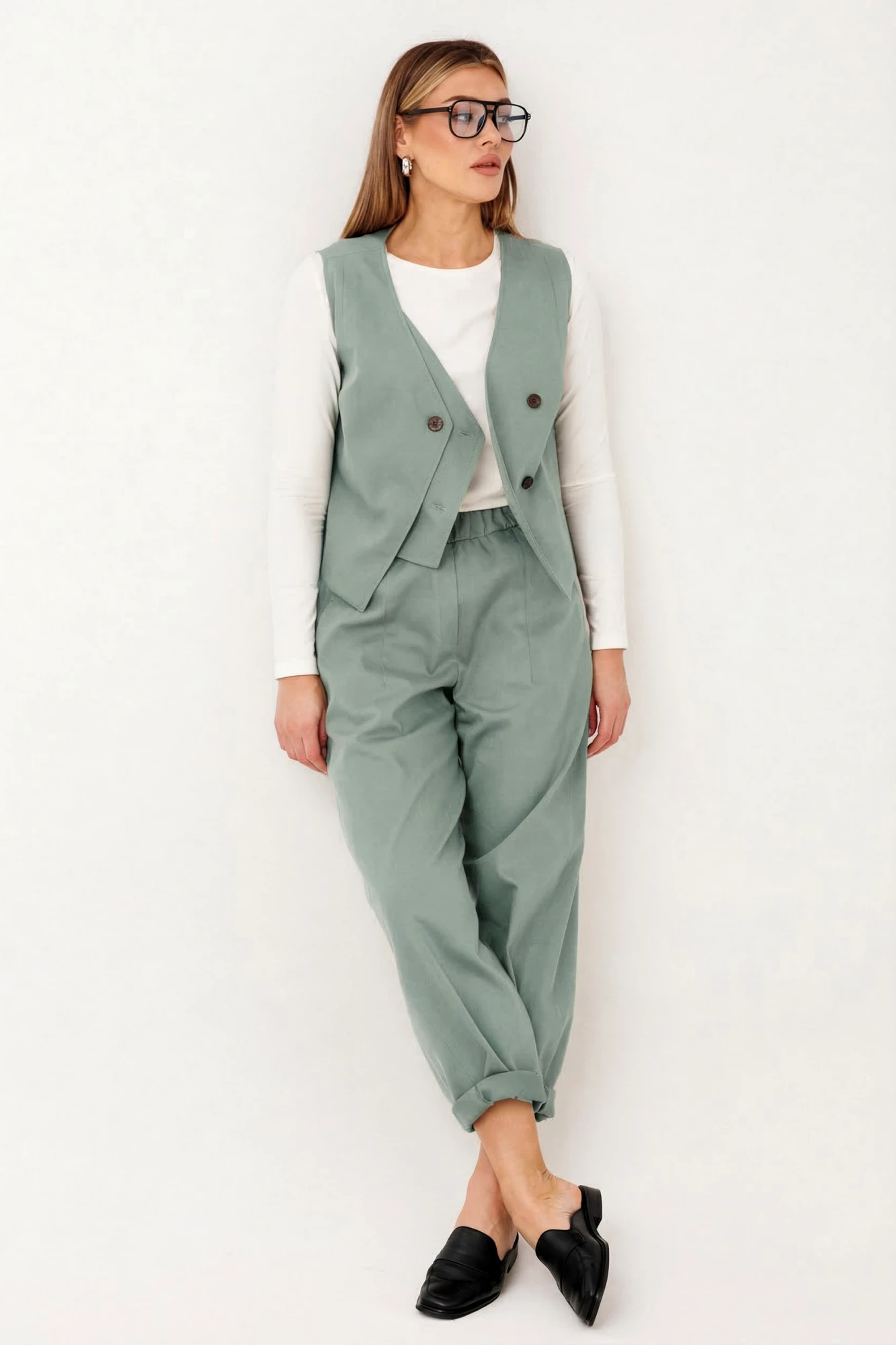 Элегантный брючный комплект в нежном фисташковом оттенке — стильное решение для создания актуального и утончённого образа. Свежий цвет придаёт лёгкость и современное звучание классическому силуэту. В комплект входит: Укороченный жилет с V-образным вырезом и застёжкой на пуговицы. Брюки свободного кроя с комфортной посадкой и заужением к низу. Жилет подчёркивает линию плеч и добавляет образу структурности, формируя аккуратный и современный силуэт. Он отлично сочетается с базовыми лонгсливами, рубашками или может носиться как самостоятельный элемент. Брюки обеспечивают комфорт и свободу движений благодаря продуманному крою. Лёгкое заужение и укороченная длина делают образ более динамичным и визуально лёгким. Преимущества комплекта: актуальный дизайн с жилетом. свежий фисташковый оттенок. комфортная посадка. универсальность для разных образов. Комплект легко адаптируется под разные стили: с лофферами — для сдержанного образа, с кроссовками — для расслабленного casual. Идеальный выбор для тех, кто ценит современную элегантность, комфорт и свежие цветовые решения.