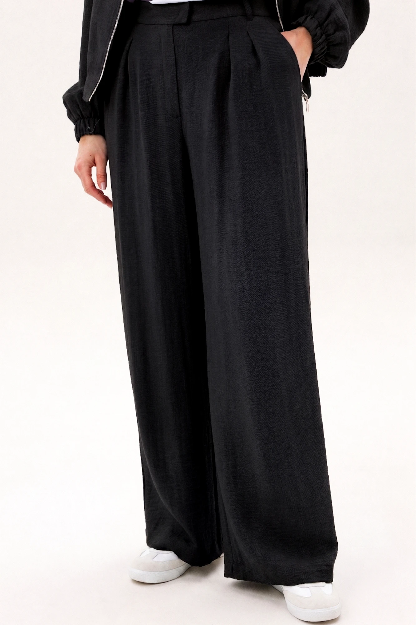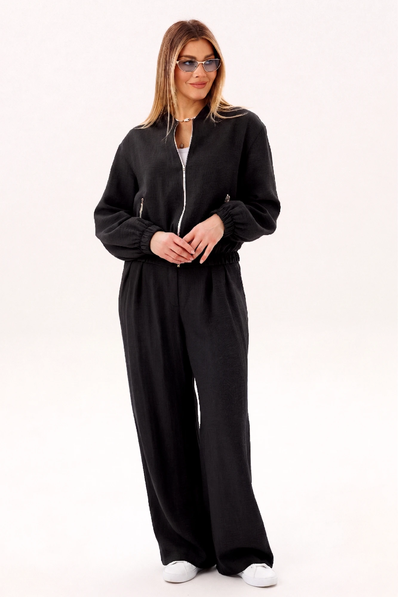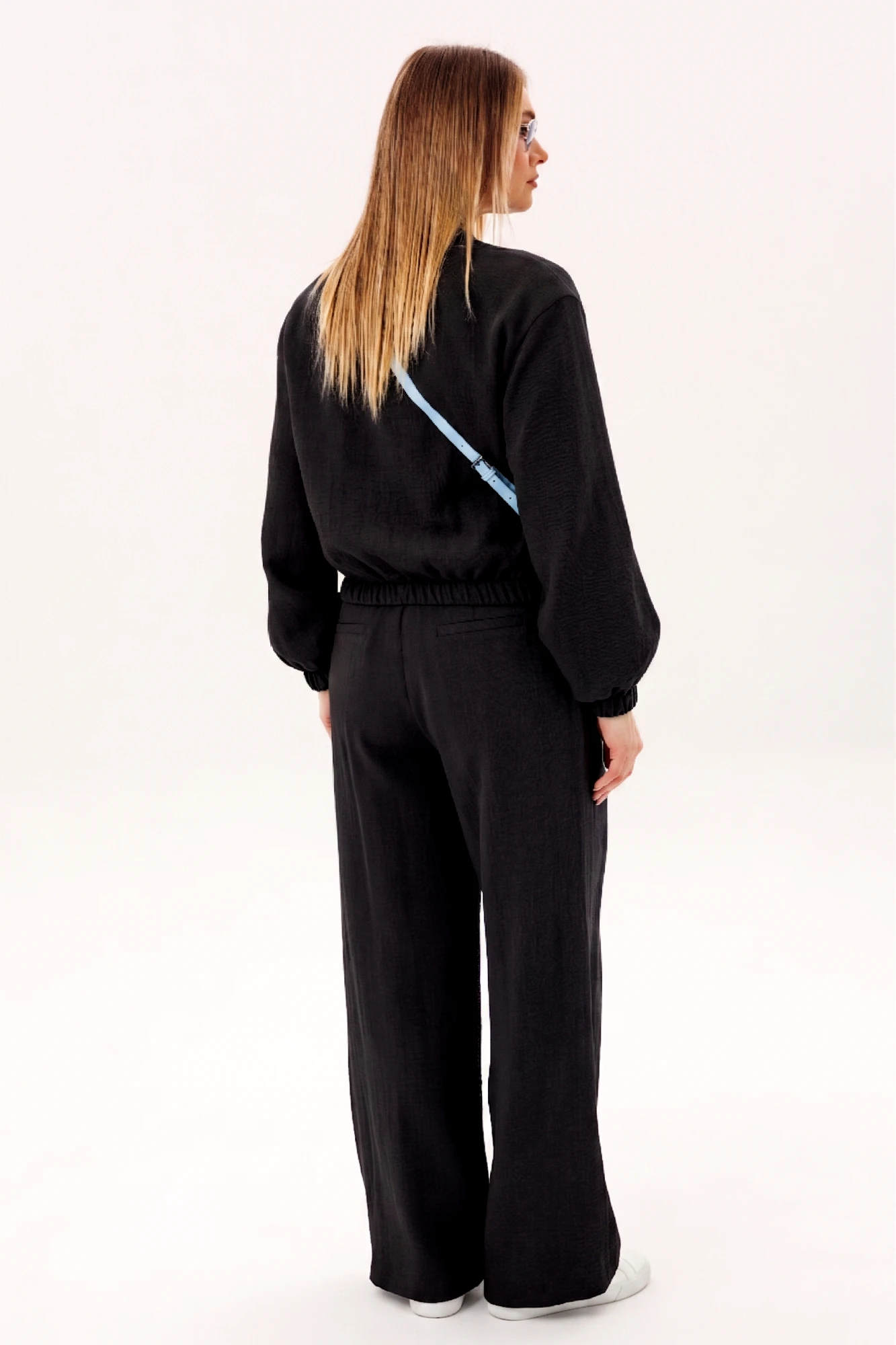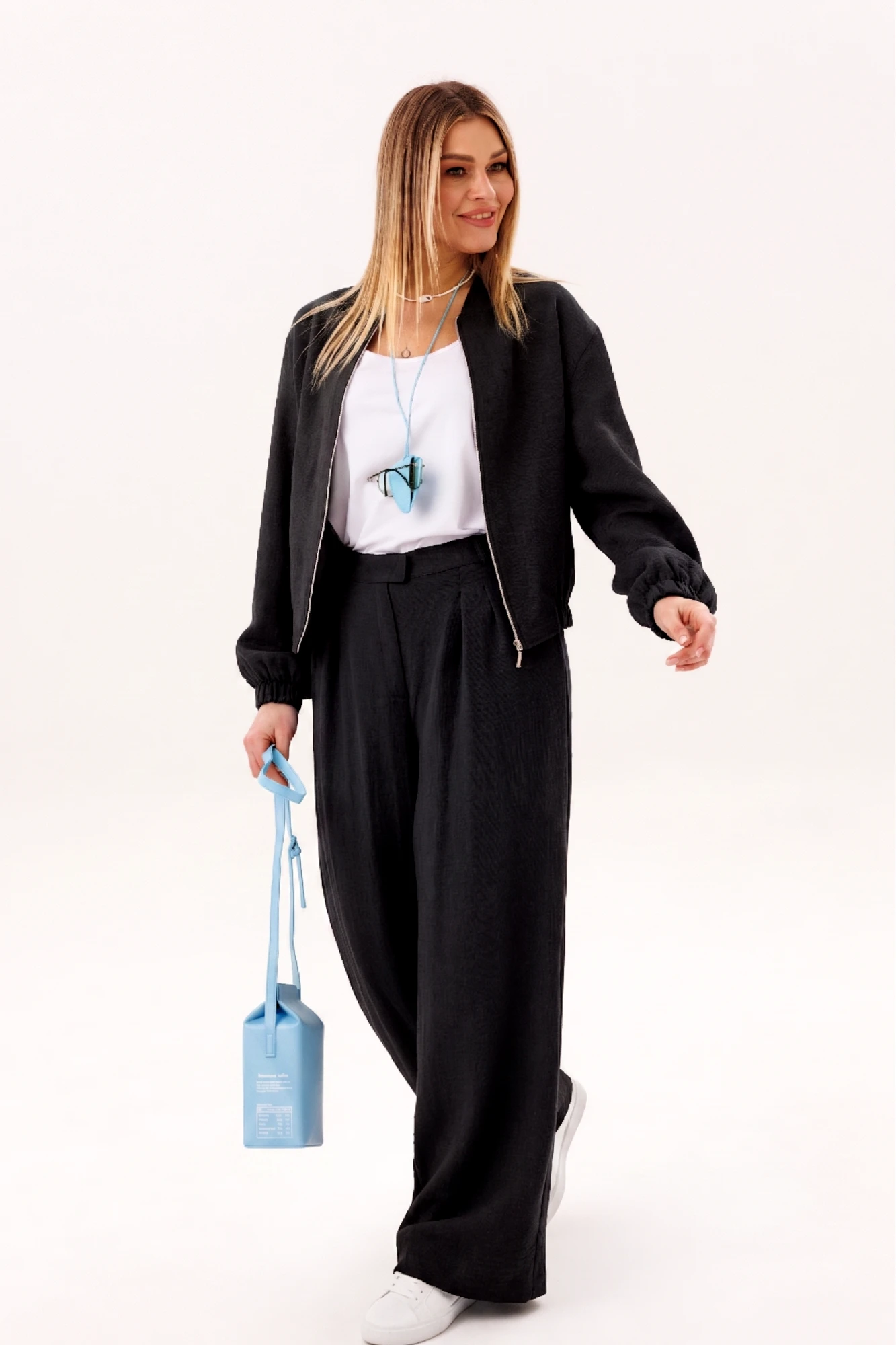 Стильный брючный комплект в благородном голубом оттенке — универсальное решение для современного гардероба. Лаконичный дизайн и свободный крой создают лёгкий, элегантный образ, который идеально подходит для повседневной жизни и городских прогулок. Комплект состоит из: Лёгкого жакета свободного кроя с мягкой линией плеч и эластичными манжетами. Широких брюк с высокой посадкой и аккуратными складками спереди. Жакет придаёт образу расслабленную элегантность и комфорт, а широкие брюки визуально вытягивают силуэт и обеспечивают свободу движений. Продуманный крой делает модель удобной и универсальной для разных типов фигуры. Изделие выполнено из приятного к телу материала, который хорошо держит форму, оставаясь лёгким и комфортным в течение всего дня. Преимущества модели: актуальный свободный силуэт, стильные широкие брюки, комфортная посадка, универсальный дизайн для повседневных образов. Комплект легко комбинируется с базовыми топами, футболками и различной обувью — от кроссовок до элегантных туфель. Это идеальный выбор для тех, кто ценит комфорт, современный стиль и практичность в одежде.