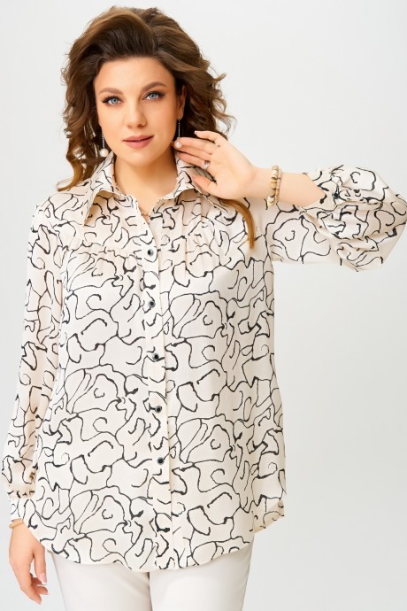 Женская блузка ""Хариса"" выполнена из текстильной ткани. Блузка прямого силуэта. Воротник отложной рубашечного типа на стойке, застежка на петли и пуговицы, планка отрезная. По спинке блузки кокетка, рукав в блузке втачной, по низку рукава манжет с застежкой на петлю и пуговицы. По полочке сборка и отрезная кокетка. Низ изделия обработан швом в подгибку с открытым срезом. В боковых швах блузки - разрезы.