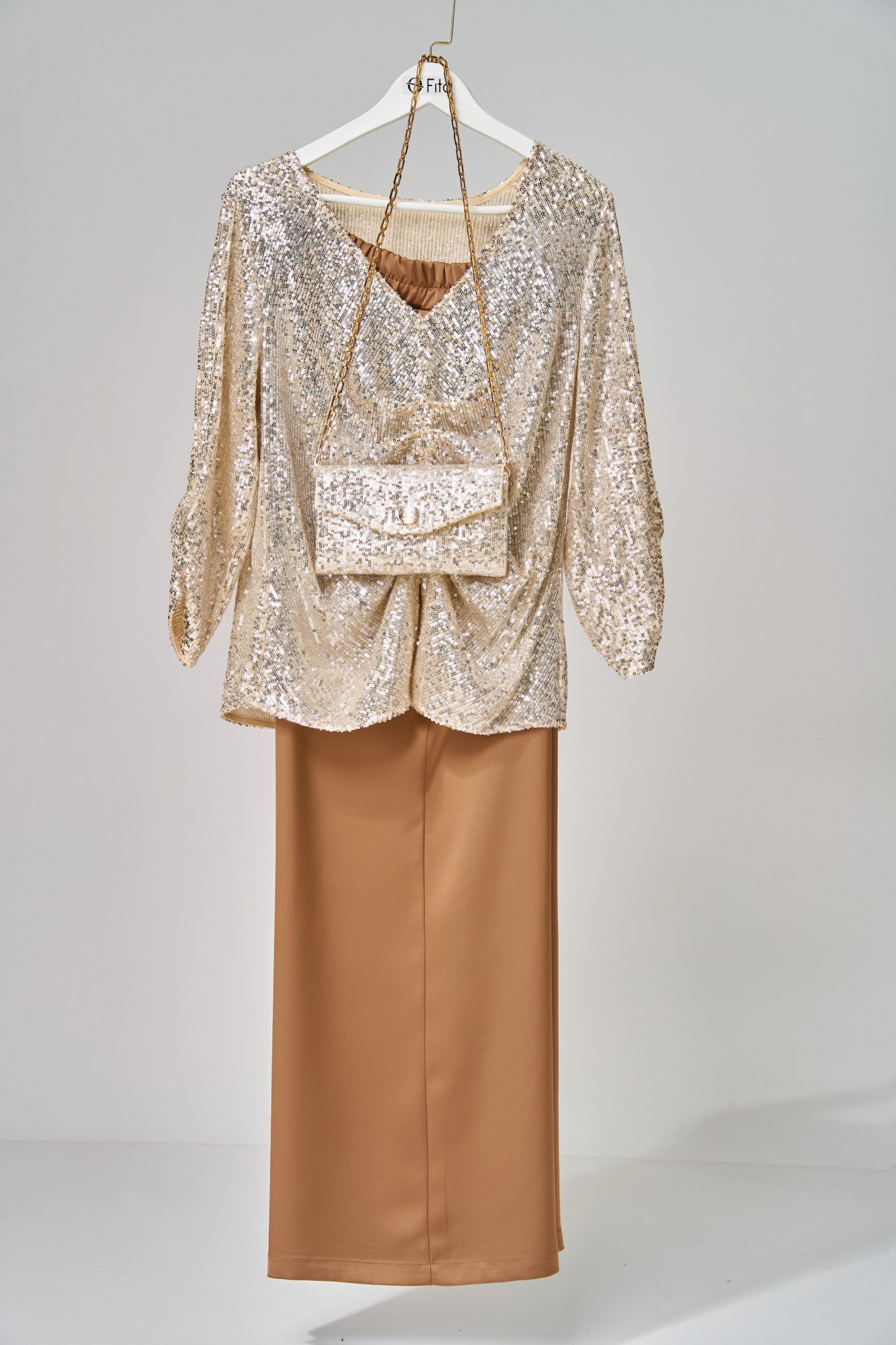 Нарядный комплект "Зария" состоит из нарядной блузки и сатиновых нарядных брюк. Нарядная блузка выполнена из мягкой трикотажной сетки в пайетки. Блузка полуприлегающего силуэта с драпировкой по полочке. Горловина в блузке v-образной формы, по низу разрез. Рукава в блузке втачные, одношовные, по низу рукава две декоративных складки. Низ изделия и низ рукавов обработаны бейкой, застроченной на 0,7 мм. Брюки широкие-прямые выполнены из сатиновой ткани. Брюки с боковыми карманами, пояс полностью на резинке. Низ брюк обработан швом в подгибку с закрытым срезом. "Зария" — сияющий образ для особенных вечеров. Блузка, расшитая пайетками, ловит свет и восхищённые взгляды, а сатиновые брюки добавляют элегантности и свободы движения. Идеальный выбор для новогодней ночи, корпоративов и торжеств, где хочется блистать.