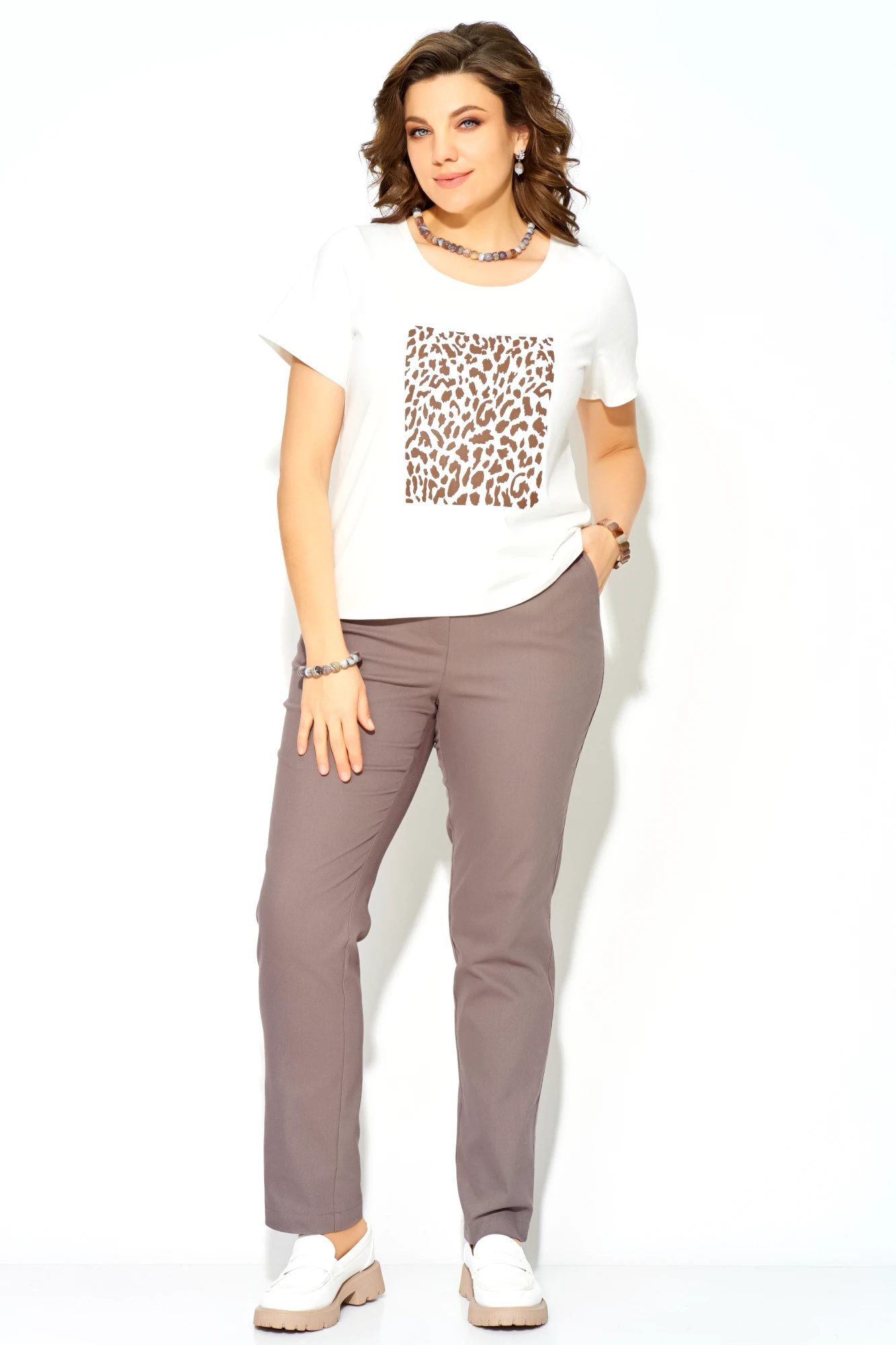 Джемпер — это голос комплекта, его эмоциональный центр. Прилегающий силуэт мягко очерчивает фигуру, а вытачка по груди — как легкий штрих скульптора. Горловина, обработанная планкой, завершает образ сдержанно и элегантно. Но главное — печать «Леопард» на полочке. Это не просто принт, это вызов, энергия, дикая грация, которая прячется под спокойной поверхностью.