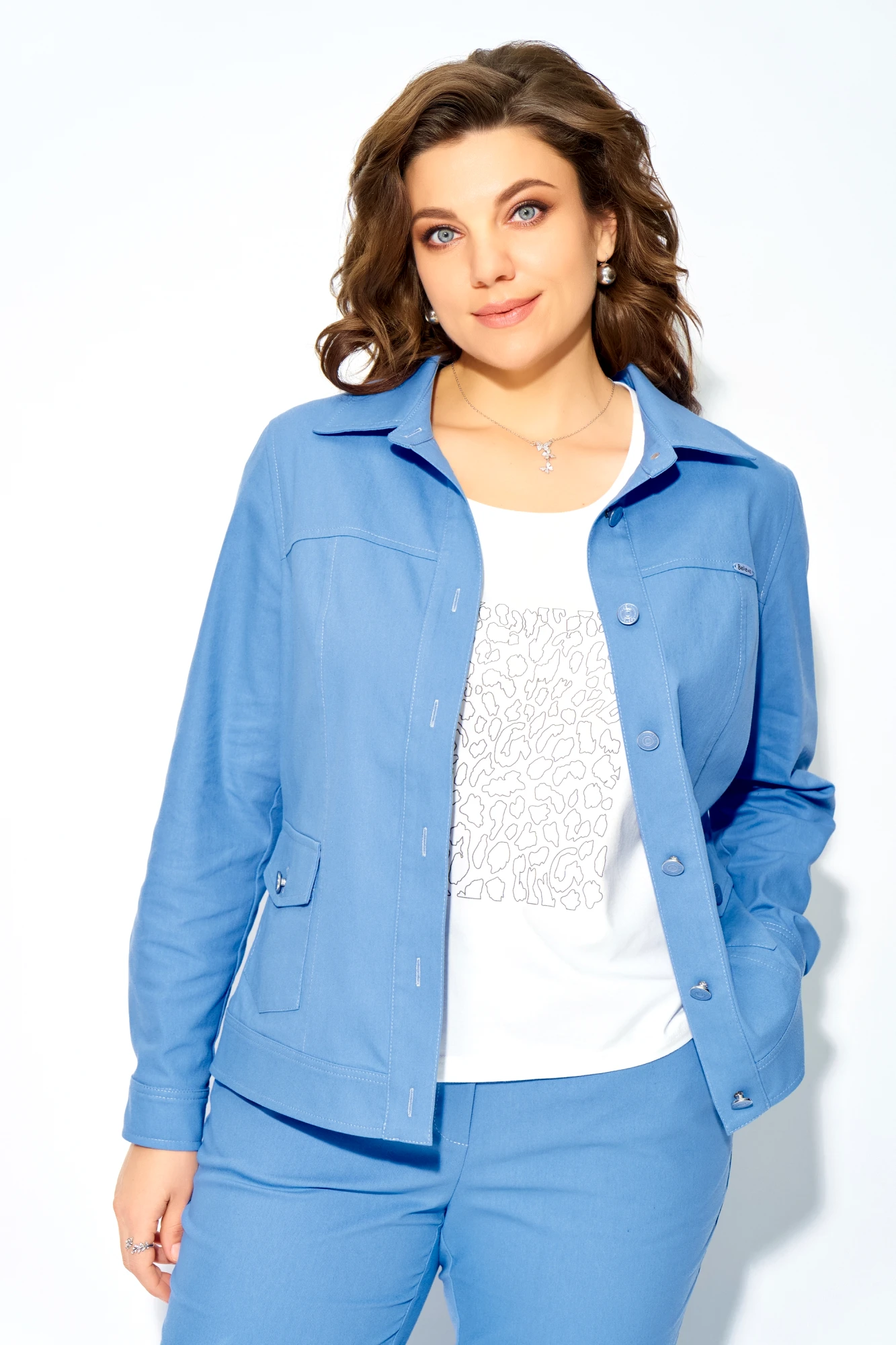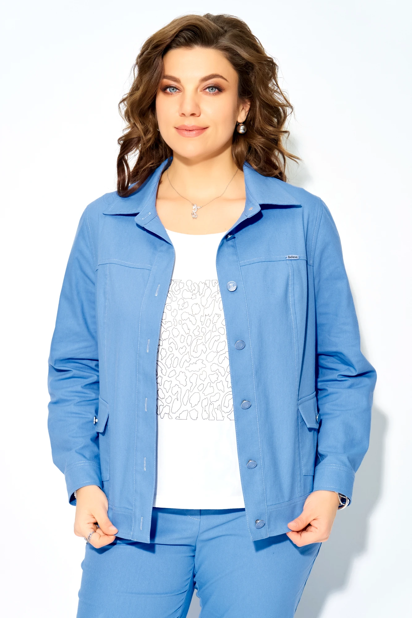 Джемпер — это голос комплекта, его эмоциональный центр. Прилегающий силуэт мягко очерчивает фигуру, а вытачка по груди — как легкий штрих скульптора. Горловина, обработанная планкой, завершает образ сдержанно и элегантно. Но главное — печать «Леопард» на полочке. Это не просто принт, это вызов, энергия, дикая грация, которая прячется под спокойной поверхностью.