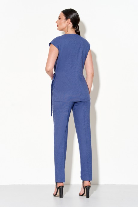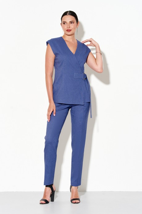 Нарядно-повседневный костюм, состоящий из жилета и брюк. Жилет полуприлегащего силуэта со спущеной линией плеча, декорирован металлической пряжкой, с втачным поясом из бокового шва, Брюки полуприлегающего силуэта, с карманами в боковых швах, застежка на тесьму-молнию. В поясе вставлены резинки для лучшего прилегания.