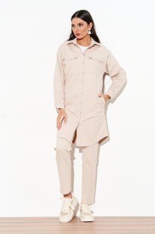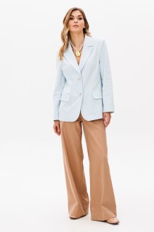 Комплект 2-х предметный из хлопковой джинсовой ткани, состоящий из жакета и брюк. Жакет прямого силуэта с втачными рукавами. По переду накладные карманы и клапаны, потайная застежка на петли и пуговицы, втачной воротник со стойкой. Брюки с высокой посадкой свободного силуэта, с резинками на поясе. По переду накладные карманы, застежка на молнию и пуговицу.
