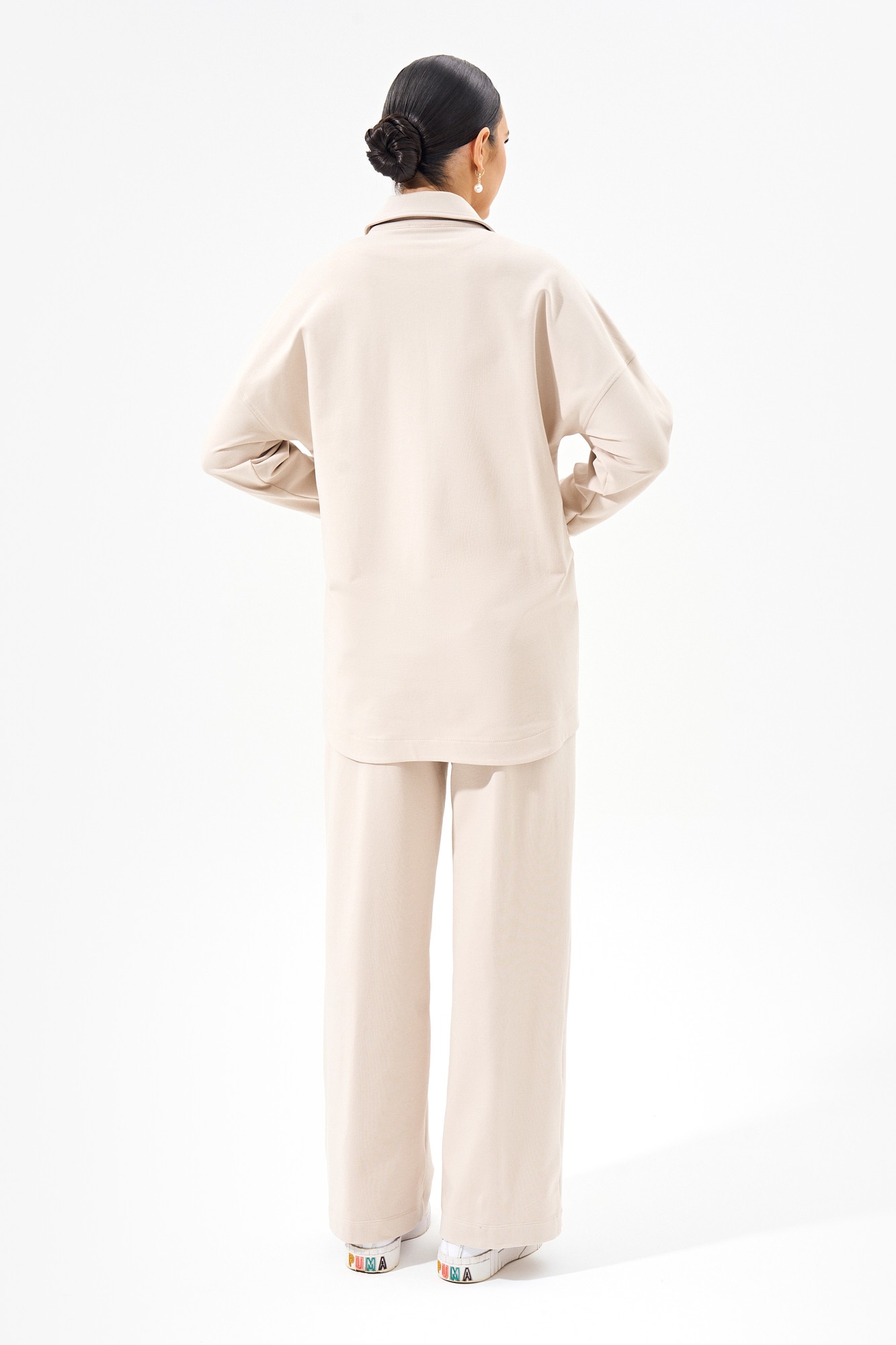 Костюм женский свободного силуэта, состоящий из рубашки и брюк, выполнен из футера двухнитки класса "пенье". Рубашка с накладными функциональными карманами по переду, рукава со спущенной линией плеча, воротник рубашечный, застежка на петли и пуговицы. Брюки прямого кроя с завышенной линией талии и карманами в боковых швах, пояс притачной полностью на резинке.