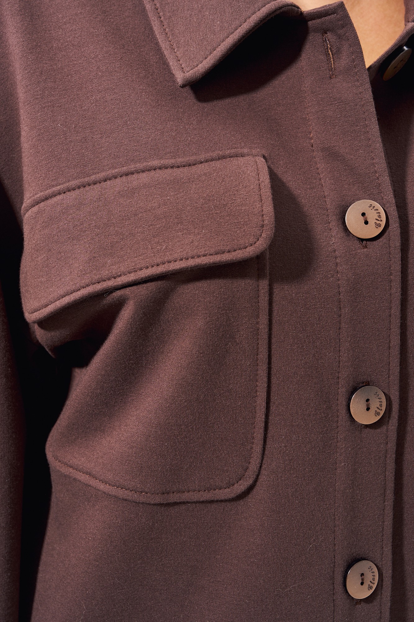 Костюм женский свободного силуэта, состоящий из рубашки и брюк, выполнен из футера двухнитки класса "пенье". Рубашка с накладными функциональными карманами по переду, рукава со спущенной линией плеча, воротник рубашечный, застежка на петли и пуговицы. Брюки прямого кроя с завышенной линией талии и карманами в боковых швах, пояс притачной полностью на резинке.