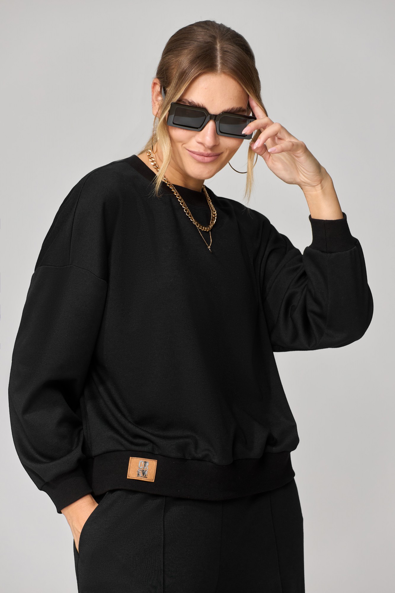 Костюм состоит из джемпера и брюк. Джемпер прямого силуэта со спущенной линией плеча. Рукав одношовный, втачной. Горловина, низ рукава и низ изделия обработаны довязом. По переду снизу на довязе настрочена декоративная нашивка. Брюки расширенные книзу с притачным прямым поясом на резинке. У брюк боковые карманы с наклонным входом. По передним частям брюк застрочены стрелки. Фурнитура может быть изменена, сохраняя целостность художественного образа. Длина джемпера - 63см, длина рукава - 50 см, длина брюк без учета пояса - 100 см.