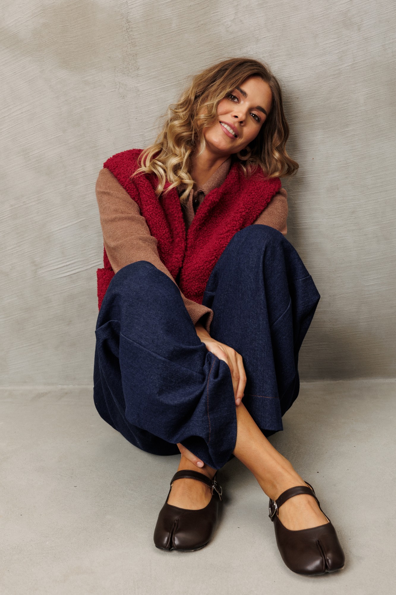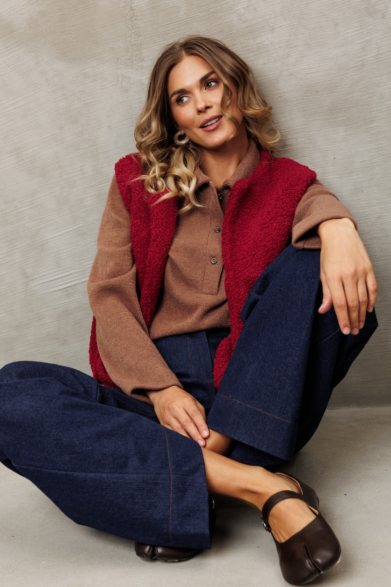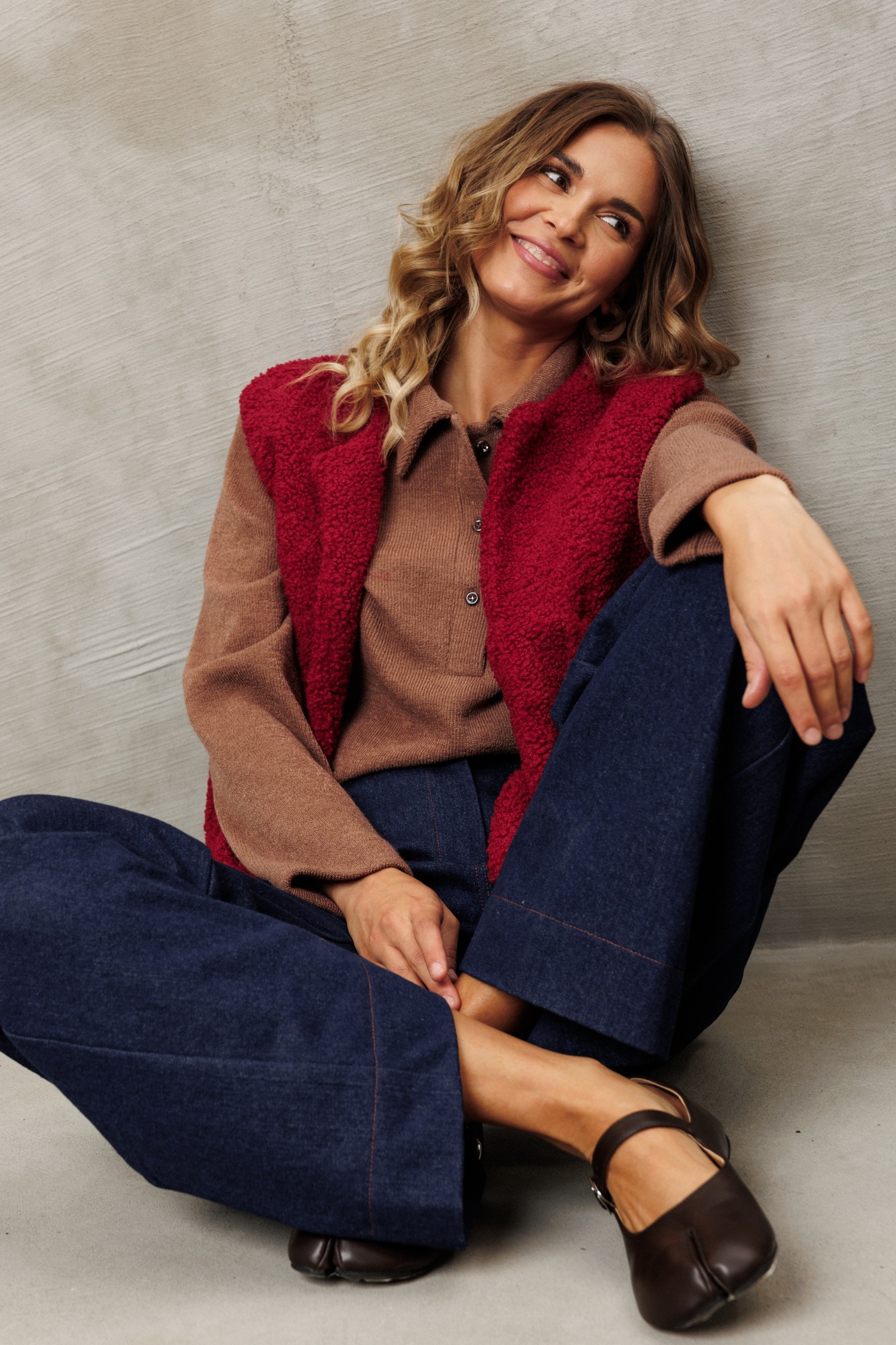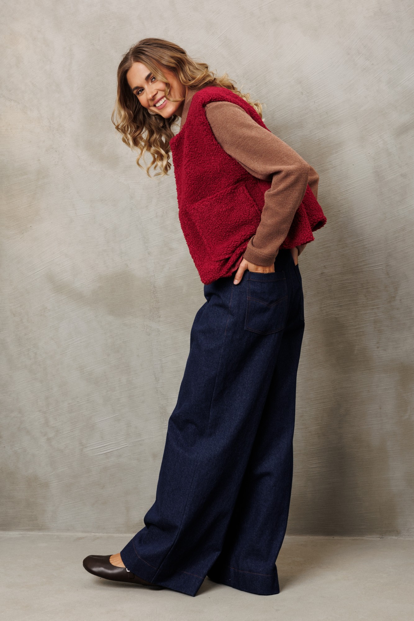 Жилет прямого свободного силуэта из теплой ткани "барашек". Перед с надстрочными карманами. Застежка на 3 петли и пуговицы. Жилет на подкладке. Брюки расширенные книзу на притачном поясе из джинсовой хлопковой ткани. По поясу настрочены шлевки. По передним и задним частям брюк вытачки. На задних частях брюк настрочены карманы. Карманы, вытачки, пояс, низ брюк отделаны отделочной строчкой.