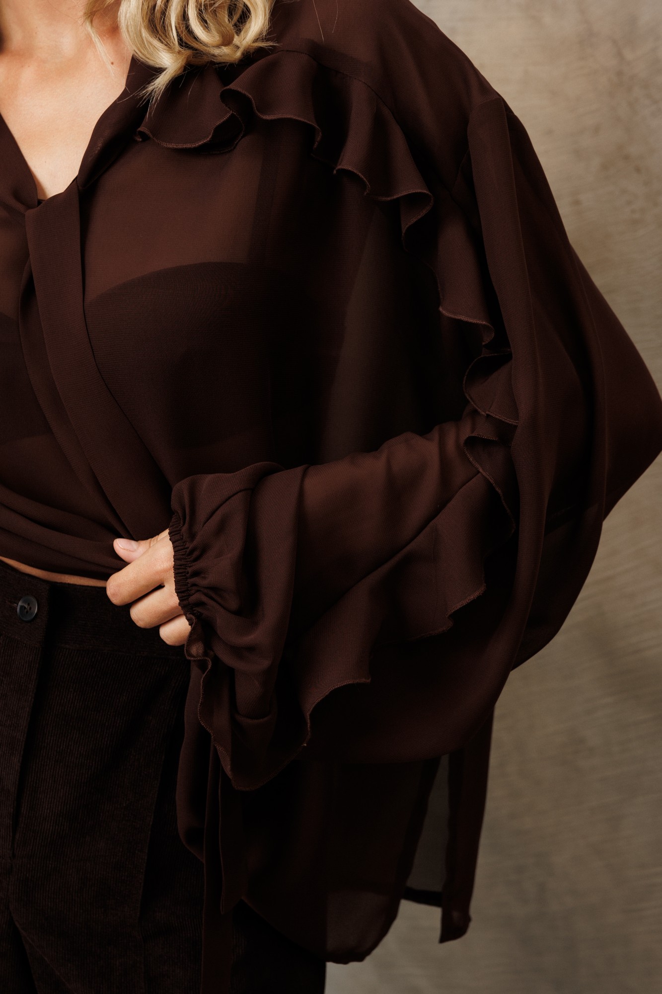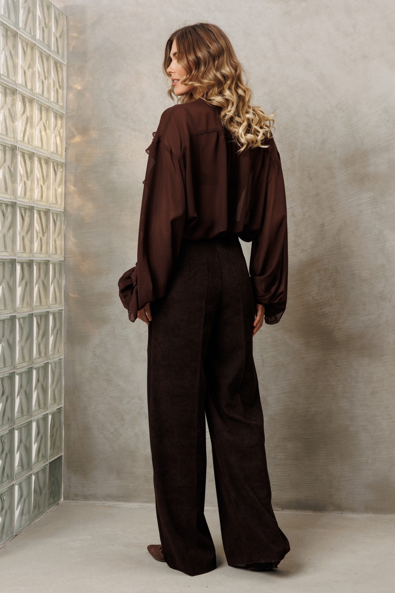 Костюм состоит из блузки и брюк. Блузка свободного силуэта из струящейся шифоновой ткани. Перед и спинка с кокеткой и сборкой. Рукав спущенный свободный с резинкой понизу. Вдоль линии кокетки и рукава вставлена рюша. Горловина V-образной формы с воротником стойкой переходящей в бант. Брюки палаццо с притачным поясом из мягкой вельветовой ткани. Спереди застежка гульфик на молнии и петлей и пуговицей по поясу. По задней частям брюк вытачки. Пояс с резинкой в боковых частях. Брюки с заутюженными стрелками.