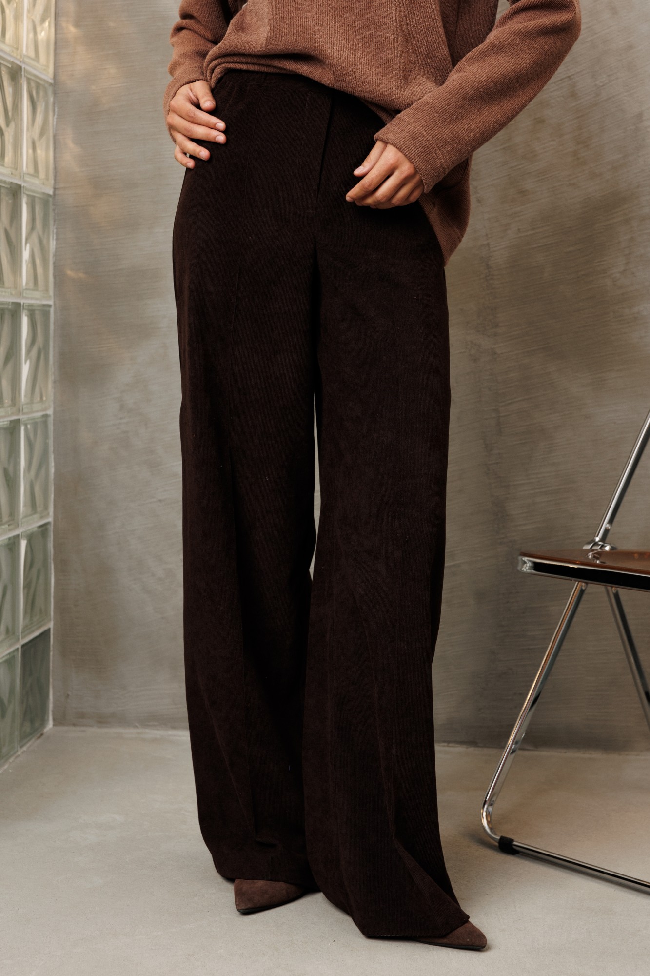 Костюм состоит из джемпера и брюк. Джемпер прямого силуэта с воротником поло из теплого трикотажного полотна. Рукав втачной одношовный. Брюки палаццо с притачным поясом из мягкой вельветовой ткани. Спереди застежка гульфик на молнии и петлей и пуговицей по поясу. По задней частям брюк вытачки. Пояс с резинкой в боковых частях. Брюки с заутюженными стрелками.