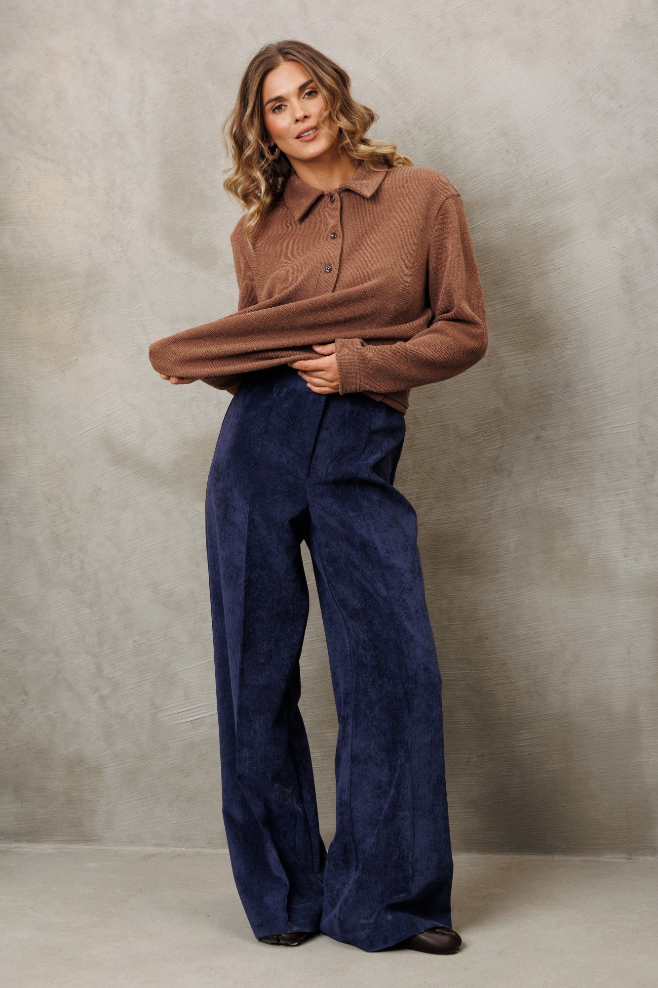 Костюм состоит из джемпера и брюк. Джемпер прямого силуэта с воротником поло из теплого трикотажного полотна. Рукав втачной одношовный. Брюки палаццо с притачным поясом из мягкой вельветовой ткани. Спереди застежка гульфик на молнии и петлей и пуговицей по поясу. По задней частям брюк вытачки. Пояс с резинкой в боковых частях. Брюки с заутюженными стрелками.