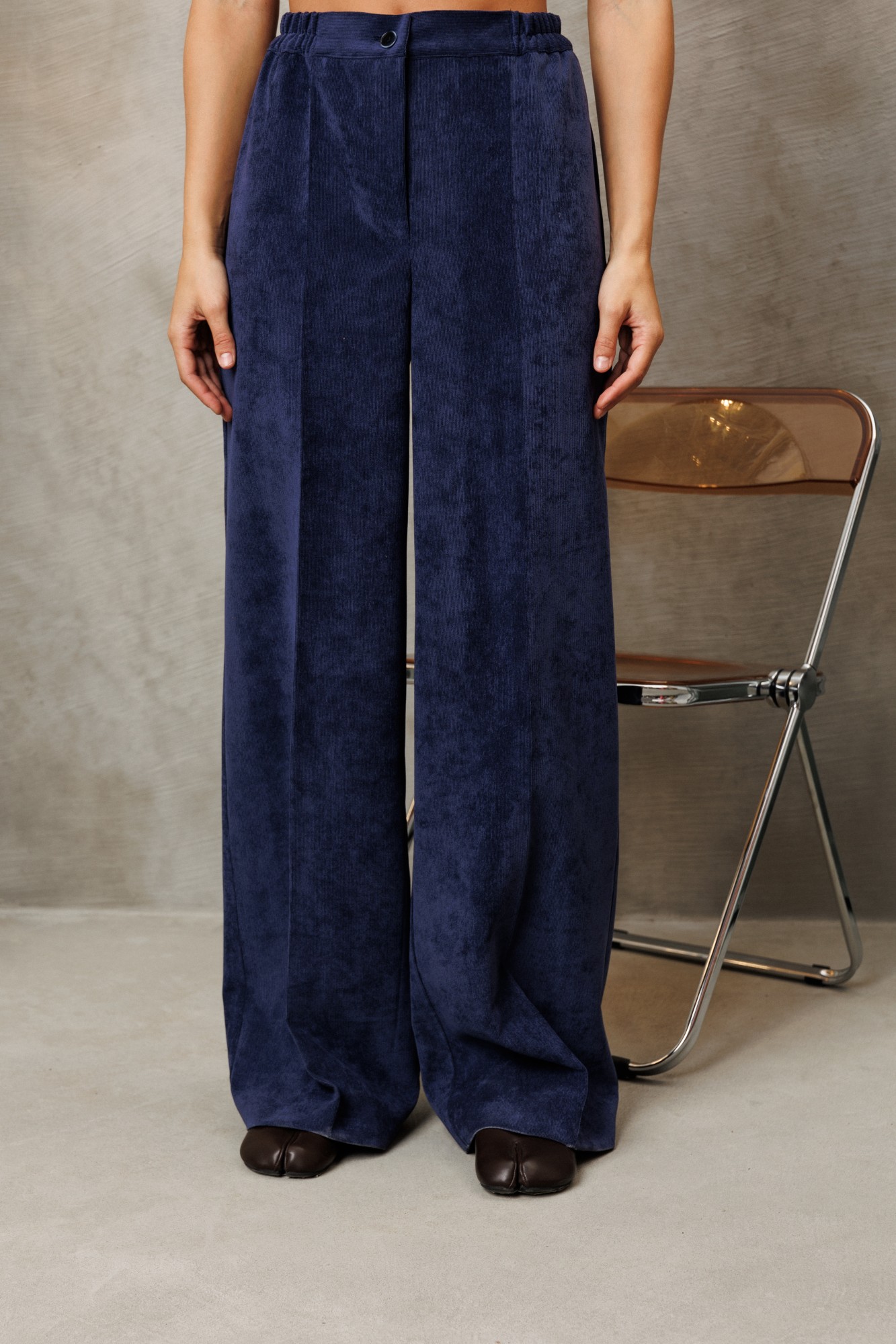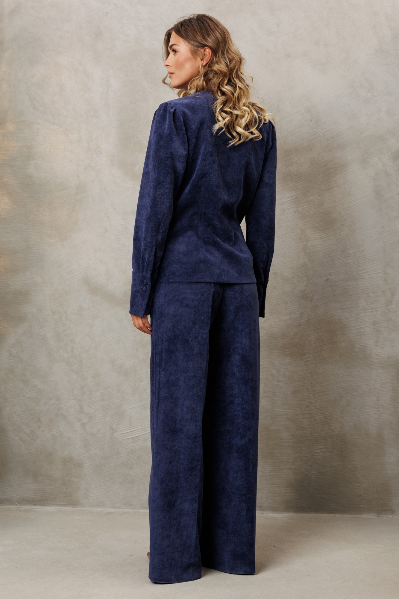 Костюм состоит из блузки и брюк. Блузка оригинальная приталенного силуэта из вельветовой ткани. Перед с подрезом под грудью, сборкой в районе груди и таллиевыми вытачками. Застёжка на петли и пуговицы. Горловина V-образной формы. Спинка с таллиевыми вытачками. Рукав втачной со сборкой по окату и с манжетой по низу. Манжета высокая с двумя петлями и пуговицами. Брюки палаццо с притачным поясом из мягкой вельветовой ткани. Спереди застежка гульфик на молнии и петлей и пуговицей по поясу. По задней частям брюк вытачки. Пояс с резинкой в боковых частях. Брюки с заутюженными стрелками.