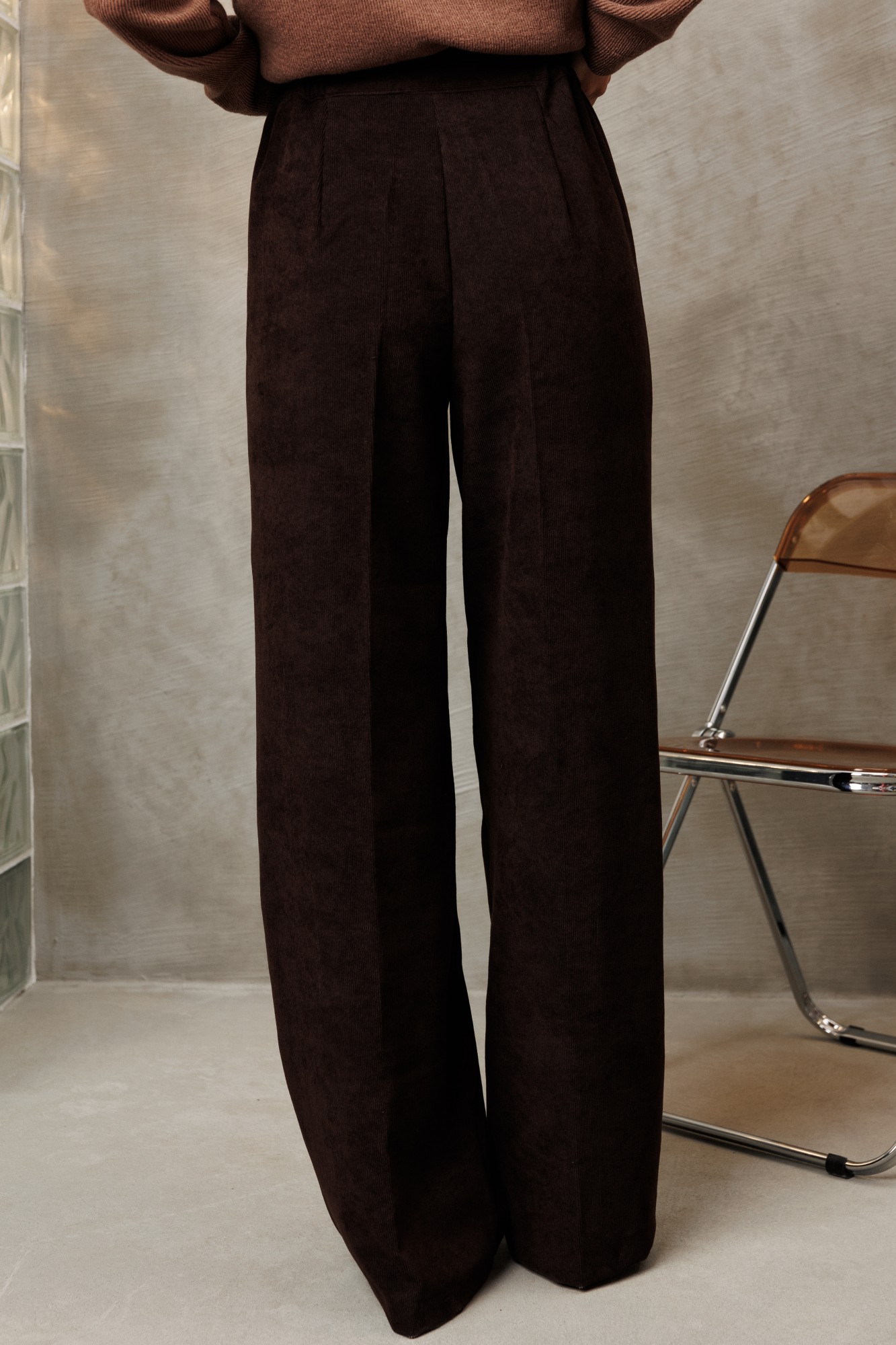 Костюм состоит из блузки и брюк. Блузка оригинальная приталенного силуэта из вельветовой ткани. Перед с подрезом под грудью, сборкой в районе груди и таллиевыми вытачками. Застёжка на петли и пуговицы. Горловина V-образной формы. Спинка с таллиевыми вытачками. Рукав втачной со сборкой по окату и с манжетой по низу. Манжета высокая с двумя петлями и пуговицами. Брюки палаццо с притачным поясом из мягкой вельветовой ткани. Спереди застежка гульфик на молнии и петлей и пуговицей по поясу. По задней частям брюк вытачки. Пояс с резинкой в боковых частях. Брюки с заутюженными стрелками.