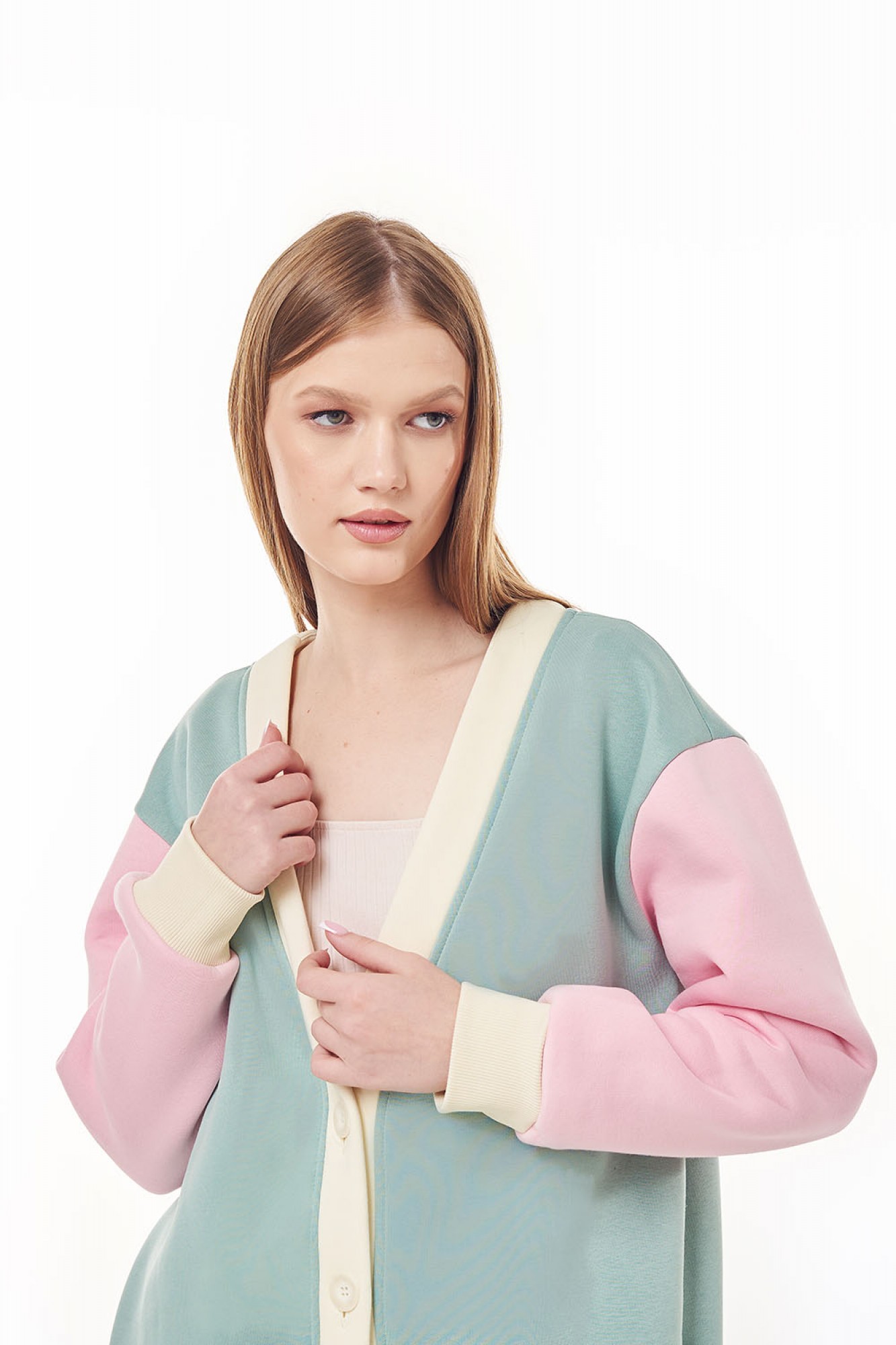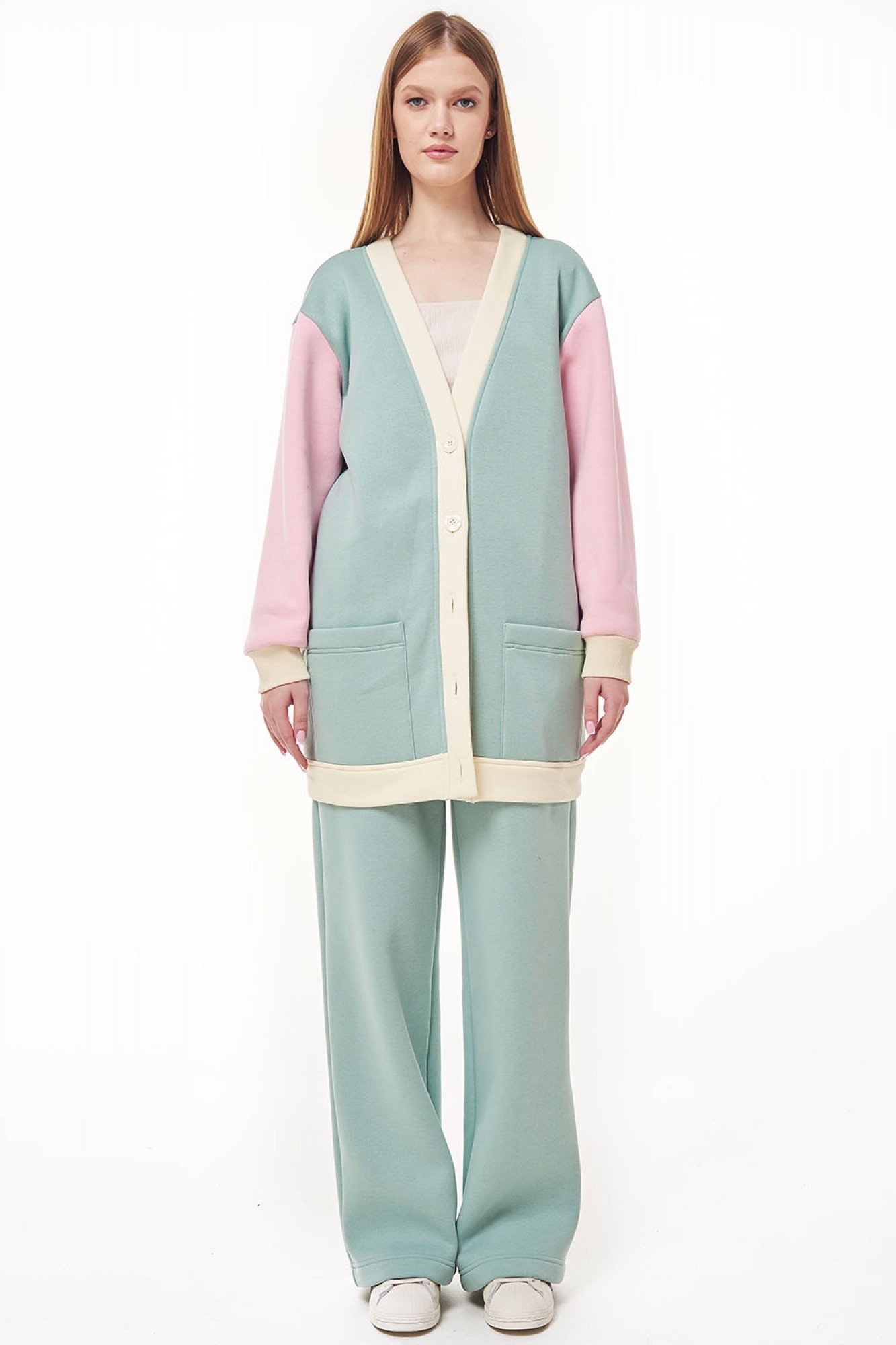 Современный комплект, состоит из кардигана мультиколор и прямых брюк. Кардиган имеет прямой силуэт и длинные рукава с манжетами (из ткани кашкорсе). Вырез горловины Y-образной формы с притачной планкой. Застежка по центру переда на петли и пуговицы. На переде удобные карманы. По планкам, по карманам, проложена отделочная строчка. Брюки длинные, прямые. По передним половинкам функциональные карманы. Пояс из ткани кашкорсе, с резинкой и шнуром внутри.