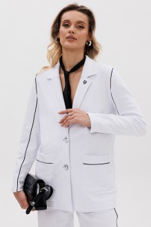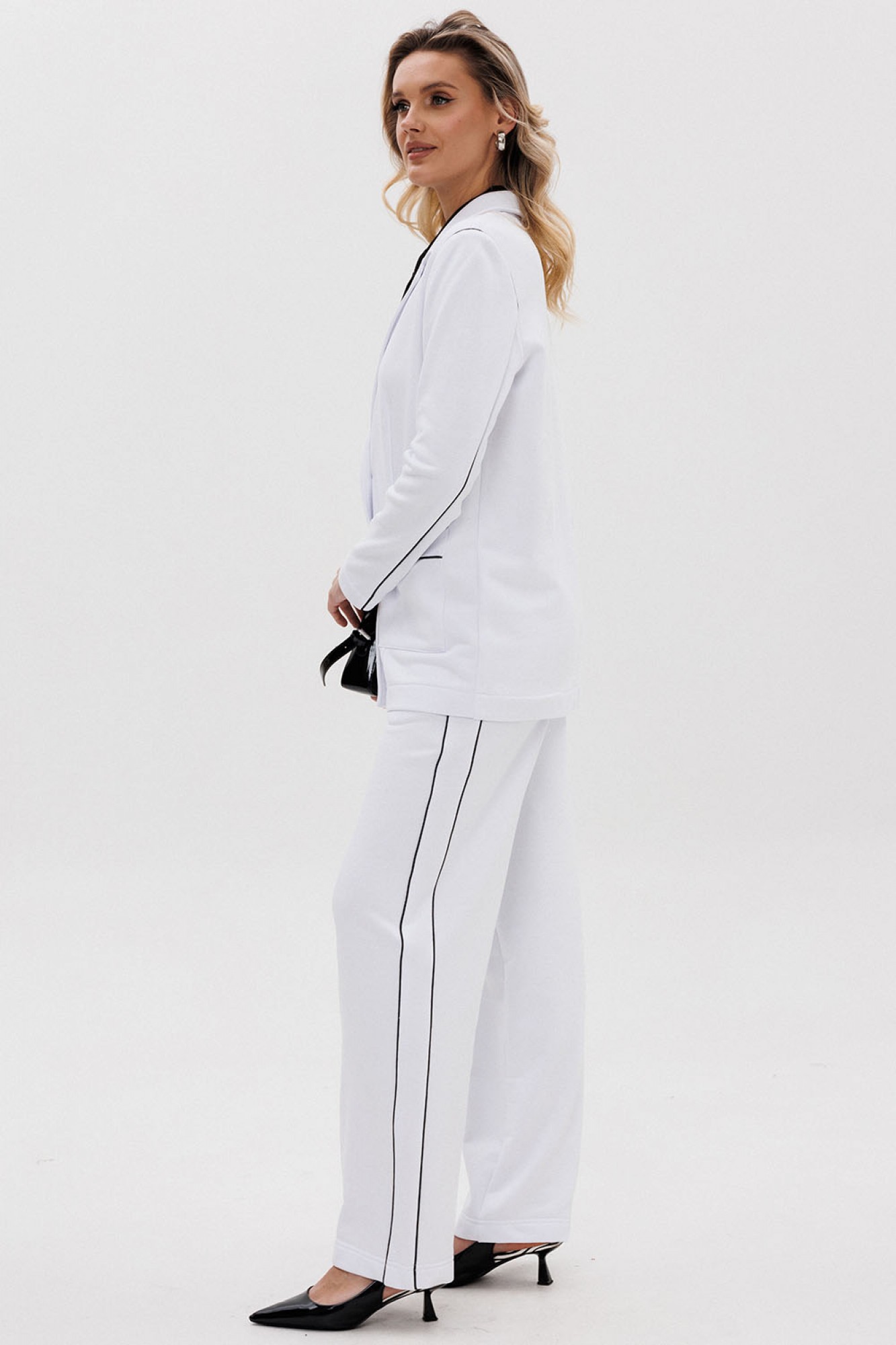 Костюм в стиле smart casual с контрастными кантами в швах создаст в меру строгий и одновременно расслабленный образ как для работы, так и торжественного мероприятия. Жакет: классический силуэт и длина, современная форма лацкана и воротника, контрастные канты в швах, контрастная вышивка-логотип на левом лацкане, функциональные карманы. Брюки: классическое облегание и посадка, контрастные канты в боковых швах, удобные боковые карманы, пояс из кашкорсе с резинкой и шнуром внутри.