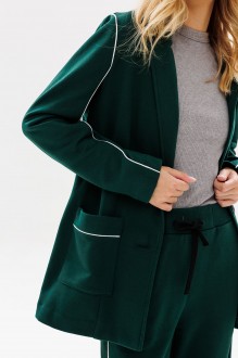 Костюм в стиле smart casual с контрастными кантами в швах создаст в меру строгий и одновременно расслабленный образ как для работы, так и торжественного мероприятия. Жакет: классический силуэт и длина, современная форма лацкана и воротника, контрастные канты в швах, контрастная вышивка-логотип на левом лацкане, функциональные карманы. Брюки: классическое облегание и посадка, контрастные канты в боковых швах, удобные боковые карманы, пояс из кашкорсе с резинкой и шнуром внутри.