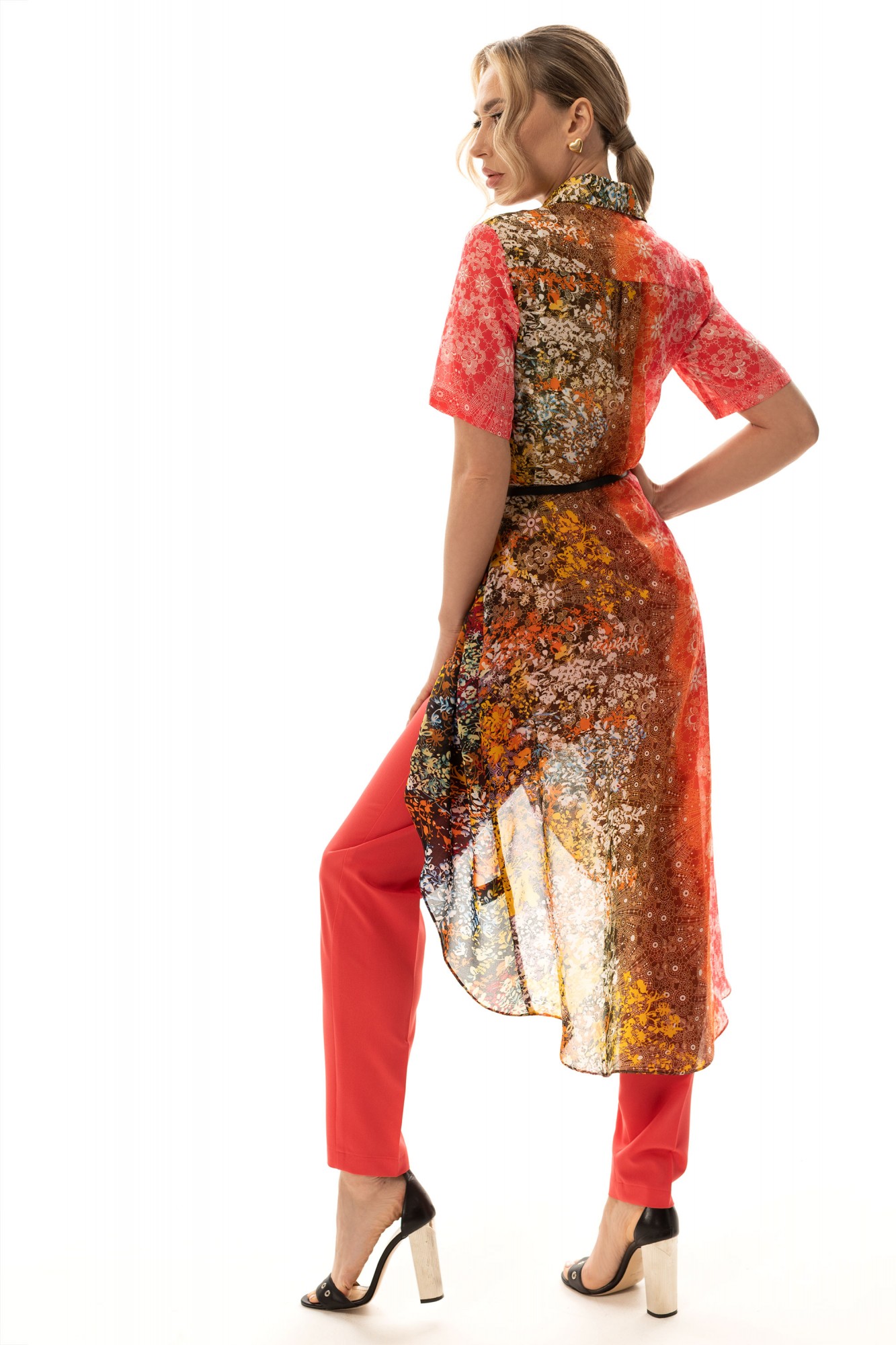 Туника с втачным воротником с отрезной стойкой, центральной застежкой на отрезной планке на петли и пуговицы. Туника отрезная по линии талии. Нижняя деталь туники с фигурной линией низа. Туника по талии присборена на резинку. Спинка с отрезной кокеткой, бантовой складкой по шву притачивания кокетки. Туника со съемным поясом Брюки с отрезным поясом, застежкой-гульфик. Верхний край брюк со шлевками : по две на передних половинках, три- на задних половинках.