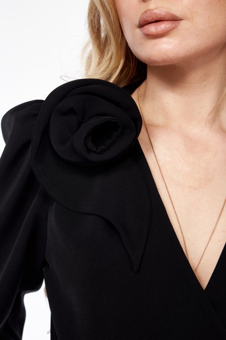 Легкий стильный костюм из струящейся ткани, состоящий из блузки и брюк. Блузка на фиксированный запах, в верхней части складки от плечевых швов, справа декор- объемный, съемный цветок. Рукав втачной, широкий, на манжете. Брюки-палаццо широкие на поясе, застежка на 2 пуговицы и тесьму молнию, боковые карманы и складки от пояса.