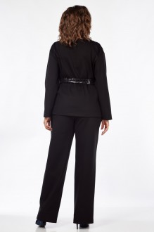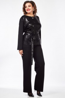Джемпер прямого свободного силуэта, выполненный из трикотажного полотна и ткани с пайетками, со спущенной линией плеча, вырез горловины «лодочка», по боковым швам – разрезы, высотой 11см. Рукава втачные, прямые. Перед джемпера из ткани в пайетки. Спинка джемпера из трикотажного полотна. В комплекте идет пояс – двухсторонний – одна сторона из ткани с пайетками, другая из трикотажного полотна.