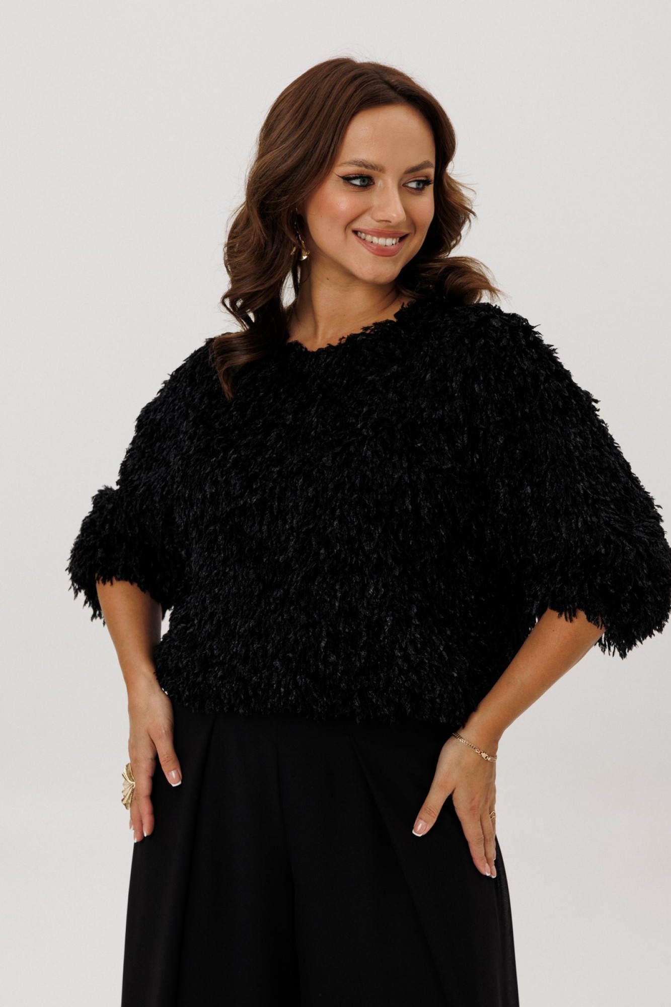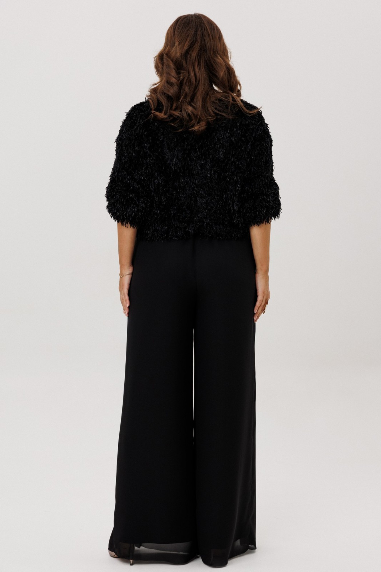 Джемпер свободного силуэта на резинке по низу и рукаве. Вырез горловины округлый, рукав цельнокроеный, застежка по спинке на петлю и пуговицу. Изделие на подкладке.