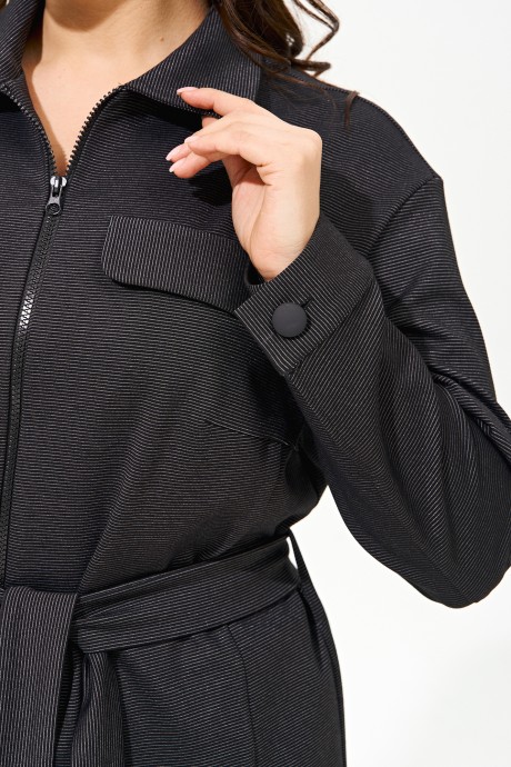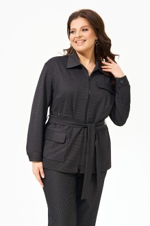 Костюм женский полуприлегающего силуэта, состоящий из жакета и брюк .Изделие выполнено из трикотажного полотна средней плотности в мелкую полоску. Жакет без подкладки, по переду декоративные рельефы, вверху клапан-обманка, внизу прорезной функциональный карман с клапаном, рукава со спущенной линией плеча, воротник рубашечного типа, застежка на молнию. В комплект входит съёмный пояс из основной ткани. Брюки классического кроя с манжетами заужены к низу, в боковых швах функциональные карманы, пояс притачной полностью на резинке.