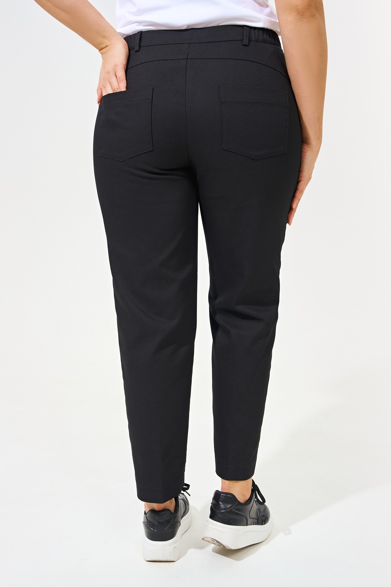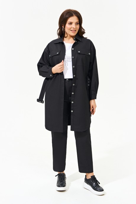 Джинсовый женский костюм с брюками и рубашкой. Рубашка удлиненная свободного силуэта с функциональными накладными карманами по переду и в боковых швах, рукава со спущенной линией плеча с манжетами, воротник рубашечный, застежка-планка на петли и пуговицы. Брюки полуприлегающего силуэта заужены к низу, пояс притачной на резинке по бокам, застежка на молнию, петлю и пуговицу, в боковых швах карманы. В комплект входит съёмный пояс из основной ткани. Материал при правильном уходе не теряет своих свойств. Инструкция по уходу: