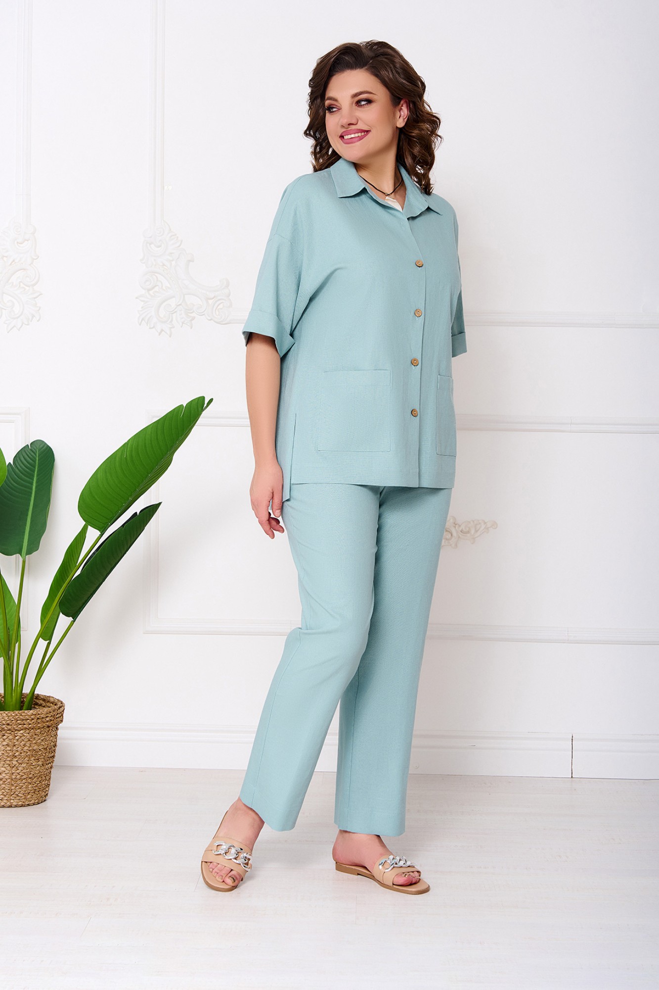Лен – невероятно красивая ткань. Костюм подойдет для повседневных встреч и отдыха. Комплект двухпредметный, состоящий из блузки и брюк. Блузка из льна, полуприлегающего силуэта, длиной до бедер, с неровной линией низа (по спинке блузка удлинена). По боковым обработаны разрезы. По переду, с правой и с левой стороны настрочены накладные карманы. Застежка на петли и пуговицы по цельнокроеной планке по переду. Воротник рубашечного типа на отрезной стойке. Линия плеча спущена, рукава одношовные, втачные, длиной до локтя. По низу рукавов отложная манжета. Брюки, прямого силуэта, длиной чуть ниже щиколотки, на притачном поясе с резинкой. По передним половинам, по боковым, обработаны карманы с наклонным входом. По шву притачивания пояса, на передних половинках, заложены складки.