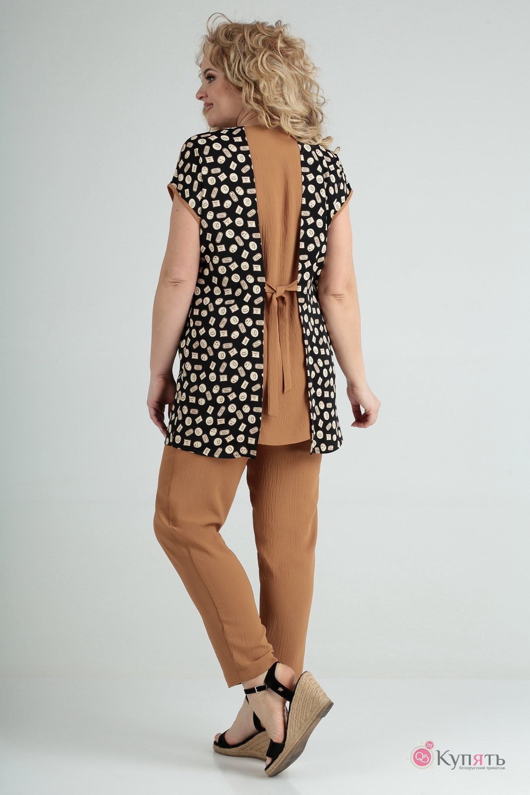 Комплект 2-х предметный из блузы и брюк. Блуза свободного силуэта со спущенным плечом из вискозной ткани. Полочка со средним швом. На одной полочке подрез со складкой и деталью из отделочной ткани с печатью. На другой полочке отделочная кокетка. На спинке вставка из отделочной ткани по всей длине, в области талии завязки. Горловина V-образной формы обработана обтачкой. Проймы окантованы отделочной тканью. Брюки удобной посадки, верх на резинке, по бокам косые карманы, к низу заужены.