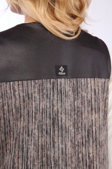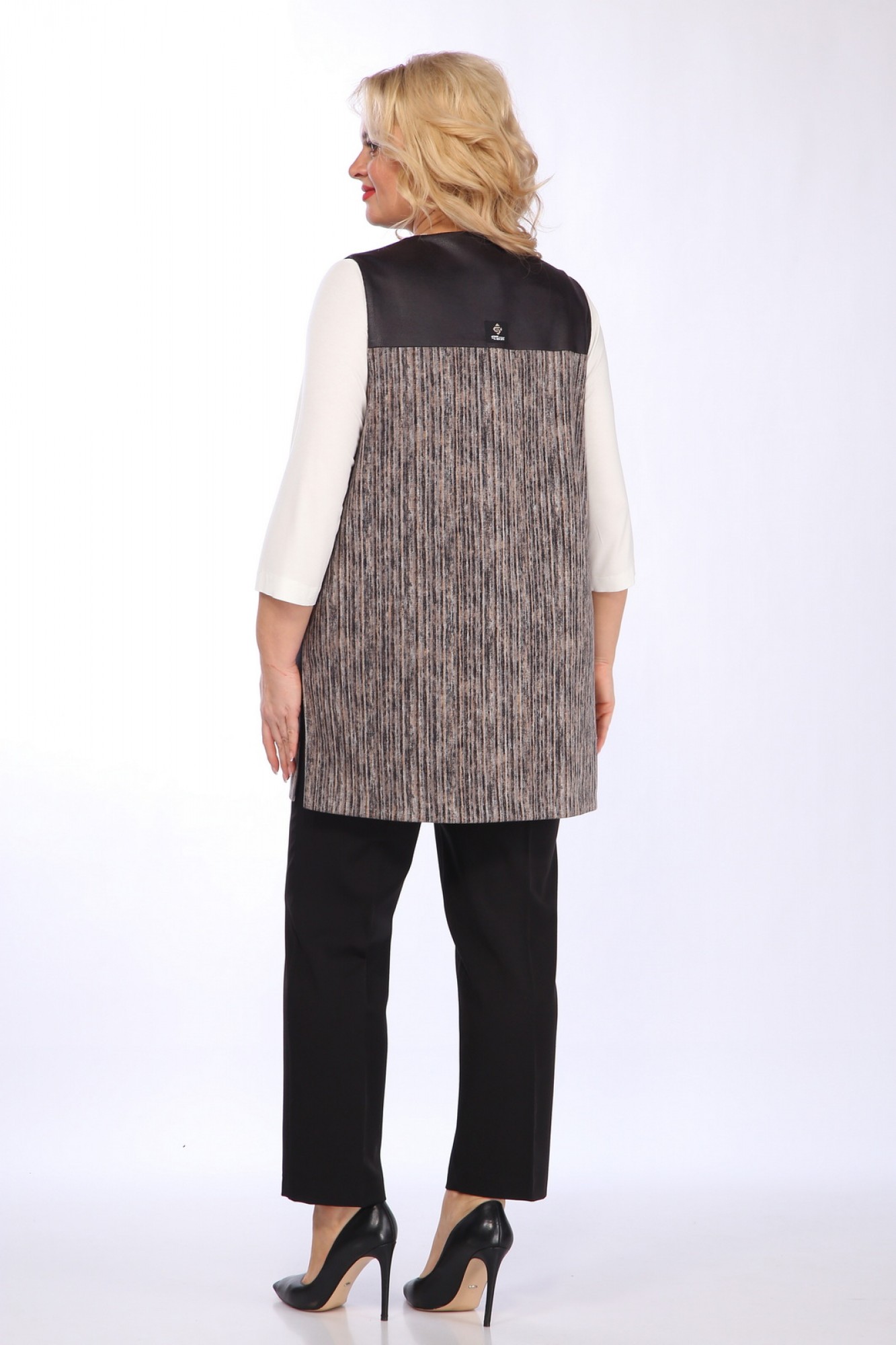 Комплект брючный 3-х предметный состоит из жилетки, брюк и джемпера. Жилетка изготовлена путем комбинирования двух видов ткани – трикотажного полотна и эко-кожи. Вырез горловины V-образной формы. Перед с подрезными боковыми деталями, в которых расположены карманы и отделочный элемент с молнией. Застежка центральная на две петли и пуговицы. Спинка на кокетке. По боковым швам обработаны разрезы. Жилет на подкладке. Брюки средней посадки изготовлены из костюмной ткани. Пояс частично на резинке. Застежка на молнию и две петли и пуговицы. Джемпер из вискозного полотна прямого силуэта дополнен термопечатью.