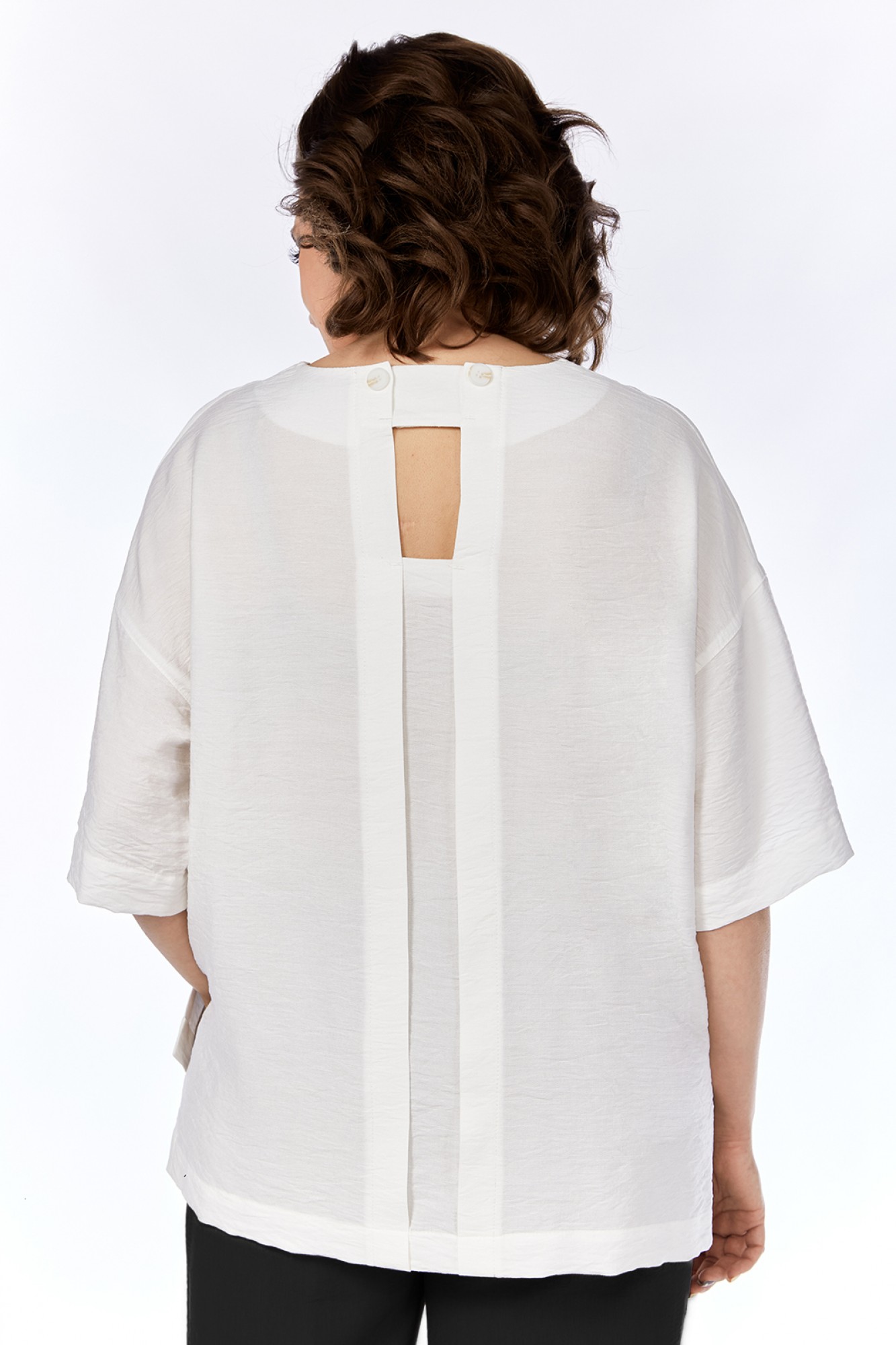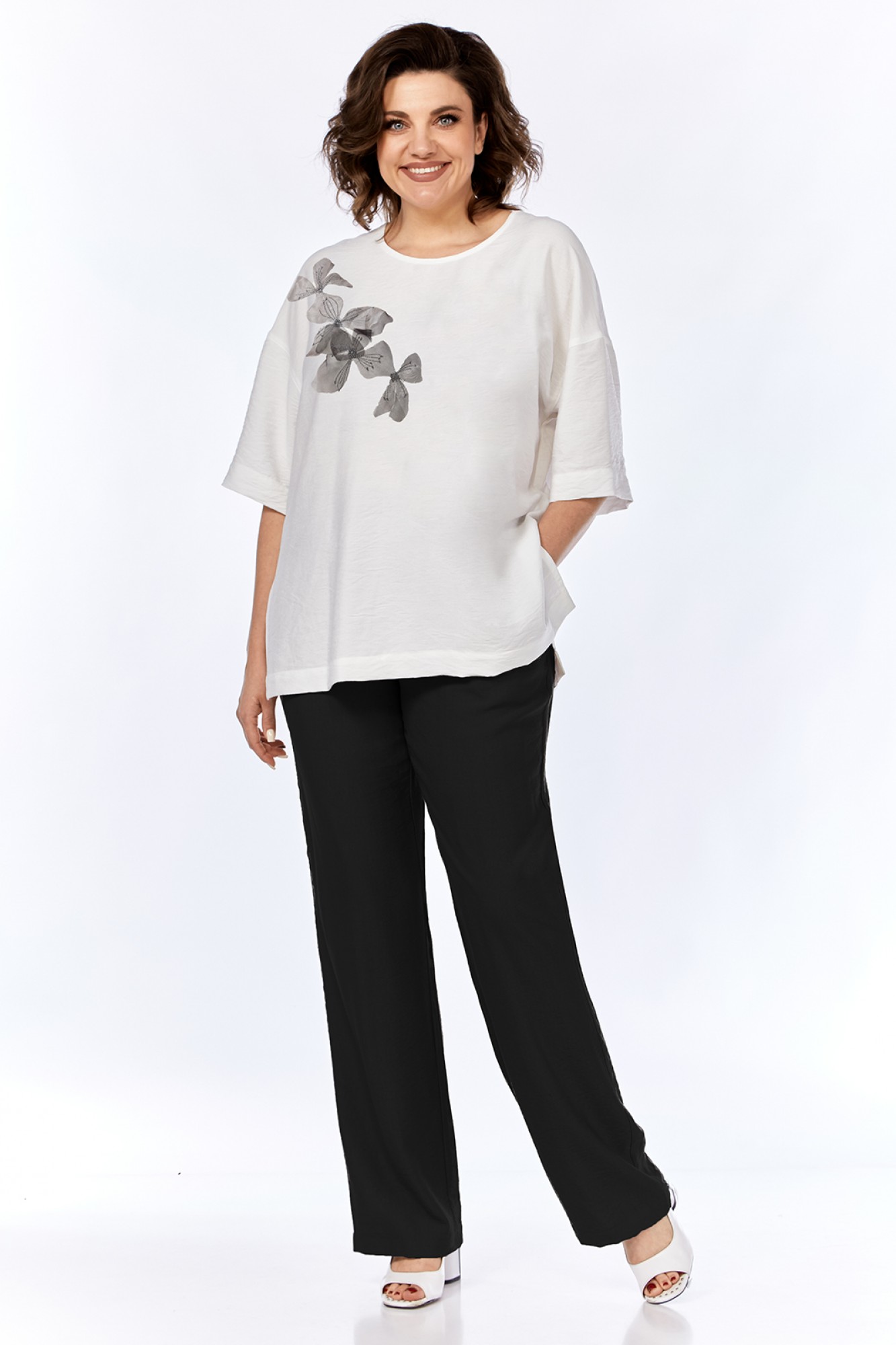 Комплект брючный изготовлен из легкой вискозной ткани с эффектом мятости. Блузка свободного силуэта. Перед с вышивкой- аппликацией, спинка с декоративными элементами по центру. В боковых швах обработаны разрезы. Рукава спущенные. Брюки прямого силуэта средней посадки. Пояс притачной на резинке. На передней части брюк обработаны карманы с подрезным бочком.
