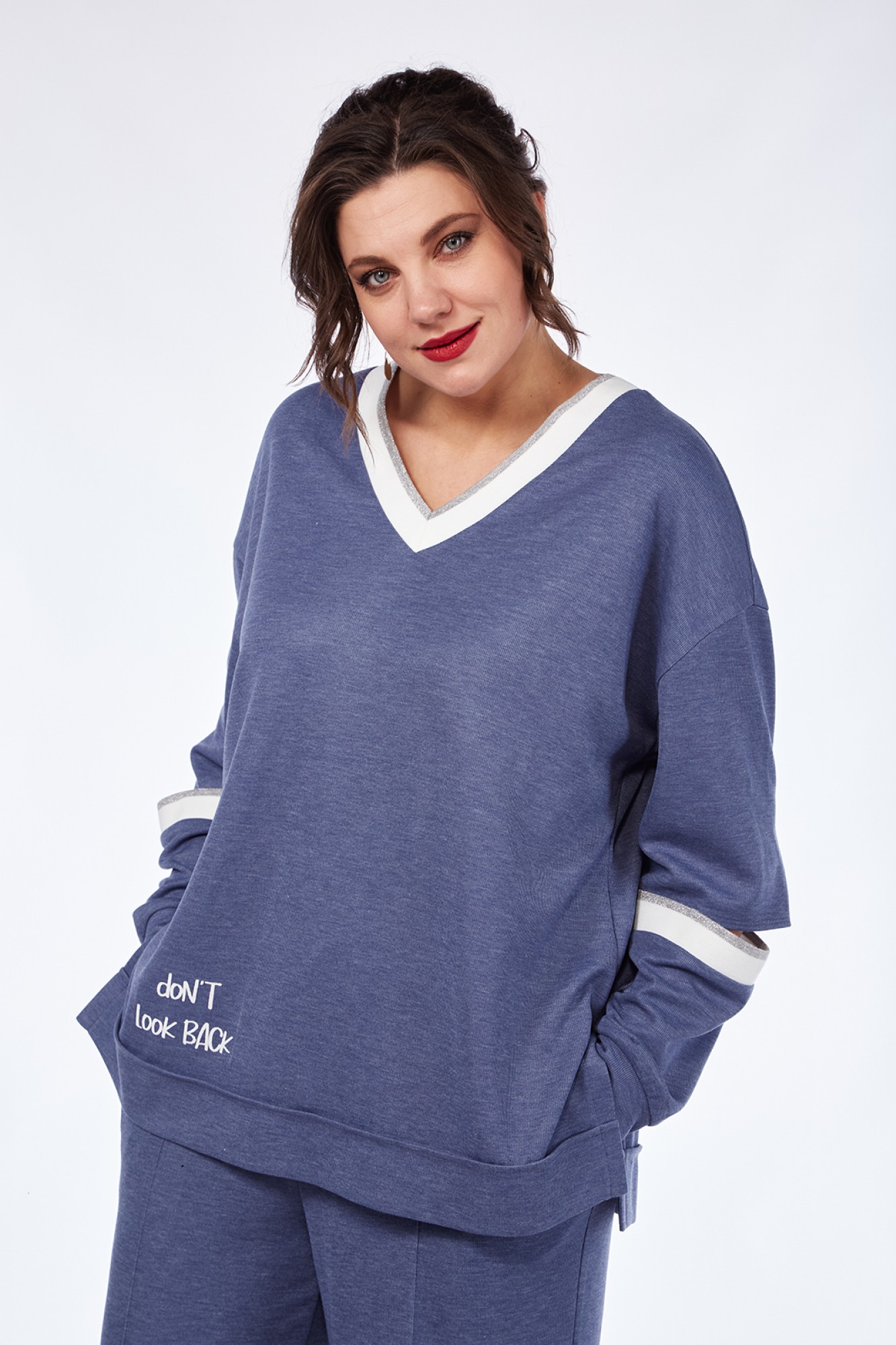 Костюм брючный 2-х предметный из трикотажного полотна. Джемпер свободного силуэта. Горловина V — образной формы, обработана довязом. Рукав спущенный длинный, с фигурными разрезами, декорированными довязами. Брюки средней посадки, пояс на резинке, обработаны боковые карманы. По передним деталям застрочен кант. Брюки прямого кроя. По низу джемпера и низу брюк — печать.