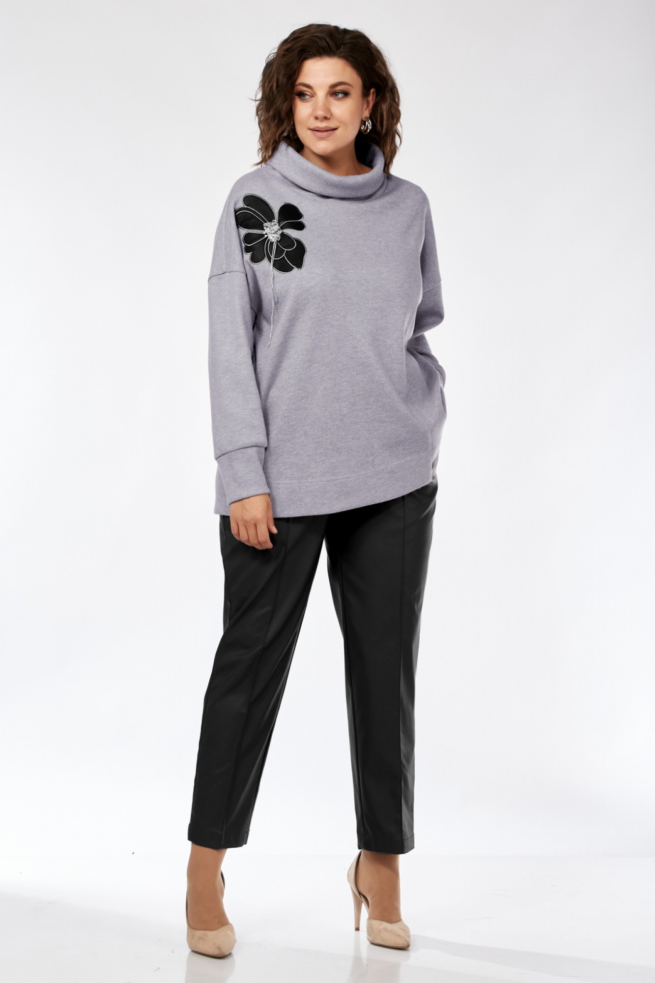 Комплект женский брючный. Джемпер свободного кроя, изготовлен из трикотажного полотна. Перед разрезной с фигурным низом. Горловина обработана воротником -хомут. Спинка цельнокроеная. Декором служит вышивка — аппликация. Брюки женские, средней посадки выполнены из экокожи. Обработаны боковые карманы. Пояс на резинке. На передних деталях брюк застрочен кант