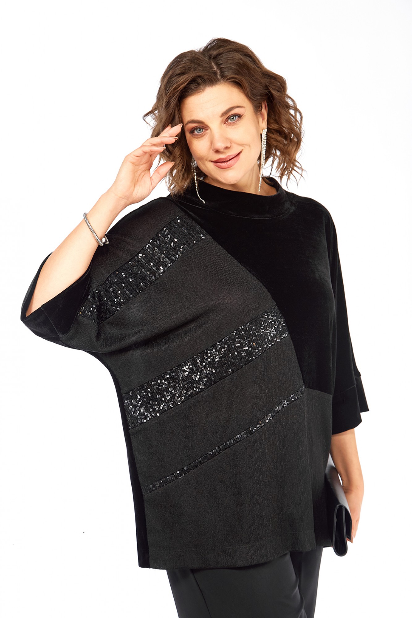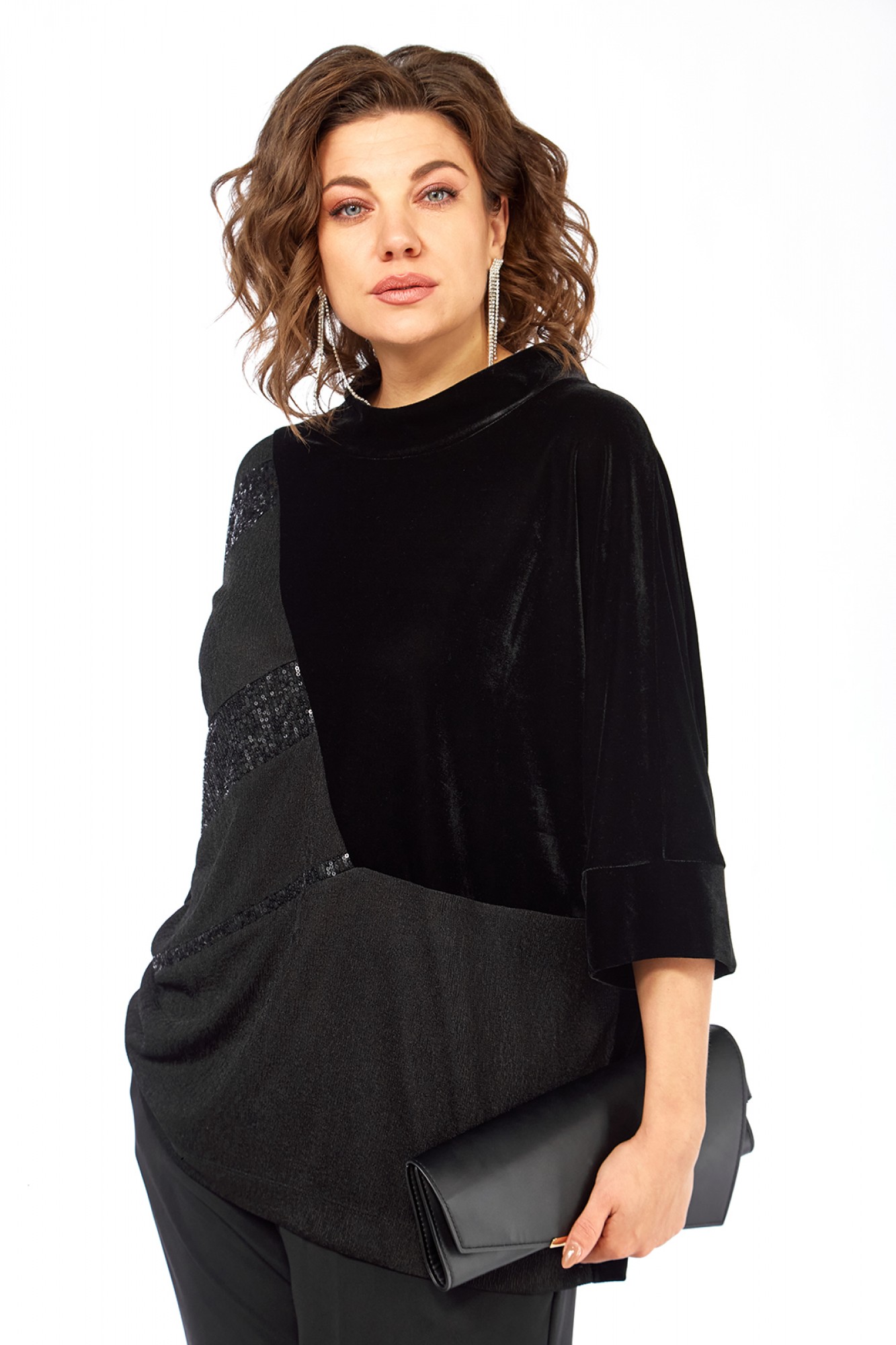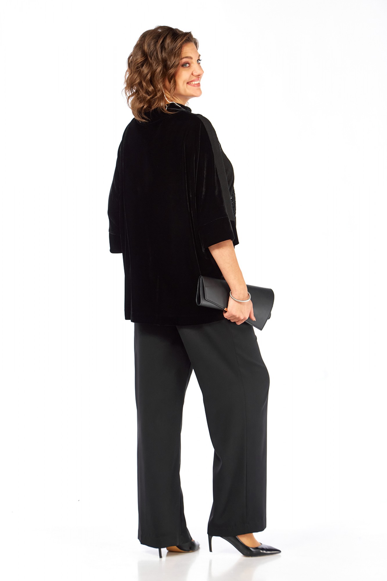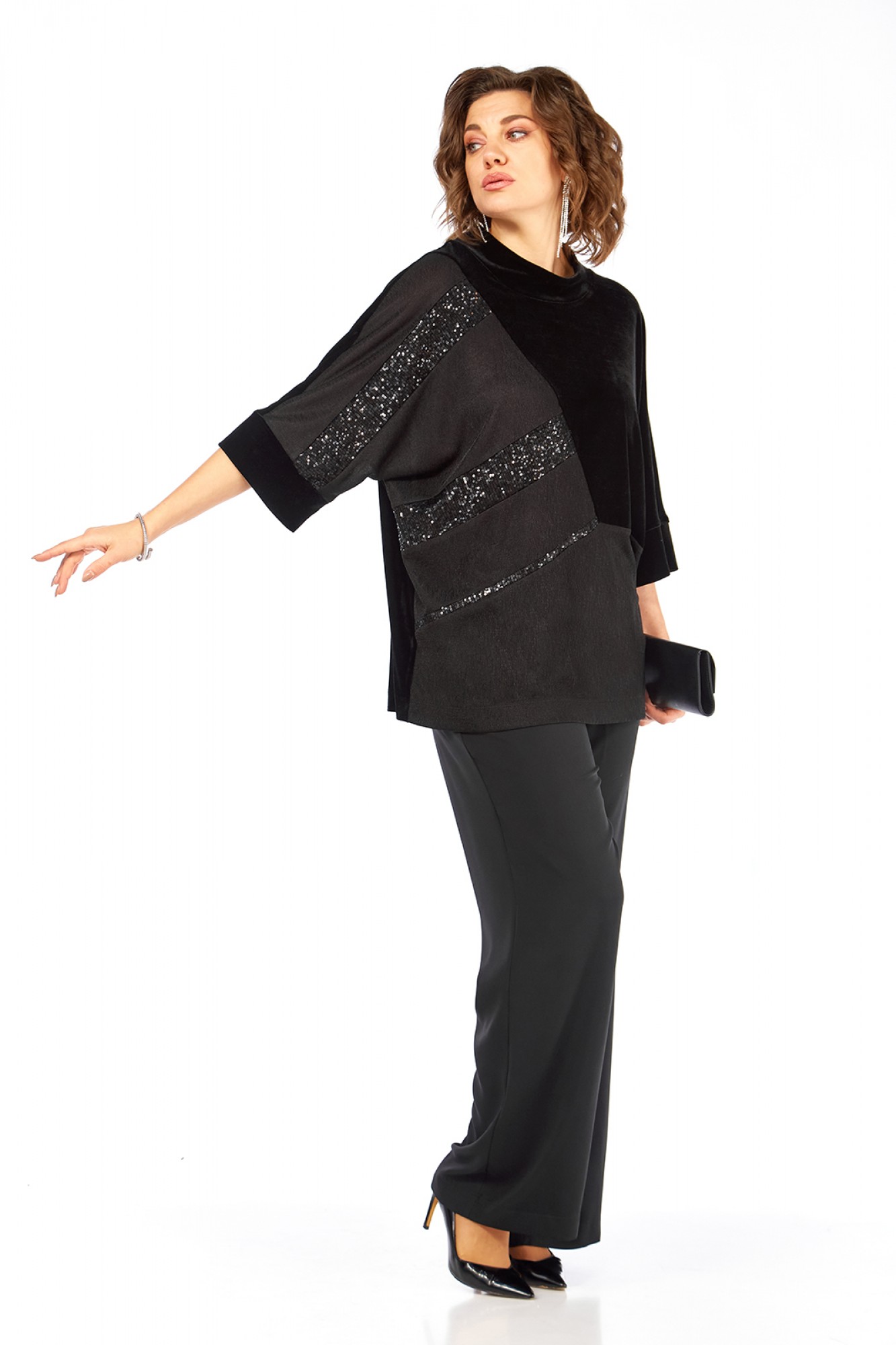 Комплект брючный, нарядный, состоит из джемпера и брюк. Джемпер женский, свободного кроя. Выполнен путем комбинирования трикотажного полотна и бархата, с декоративными вставками из пайеток по переду. Горловина обработана воротником стойкой. Рукава цельнокроеные с притачными манжетами. Брюки прямого силуэта из костюмно-плательной ткани. Пояс притачной на резинке. В брюках обработаны карманы.