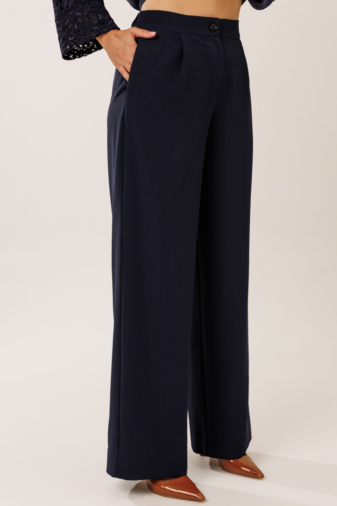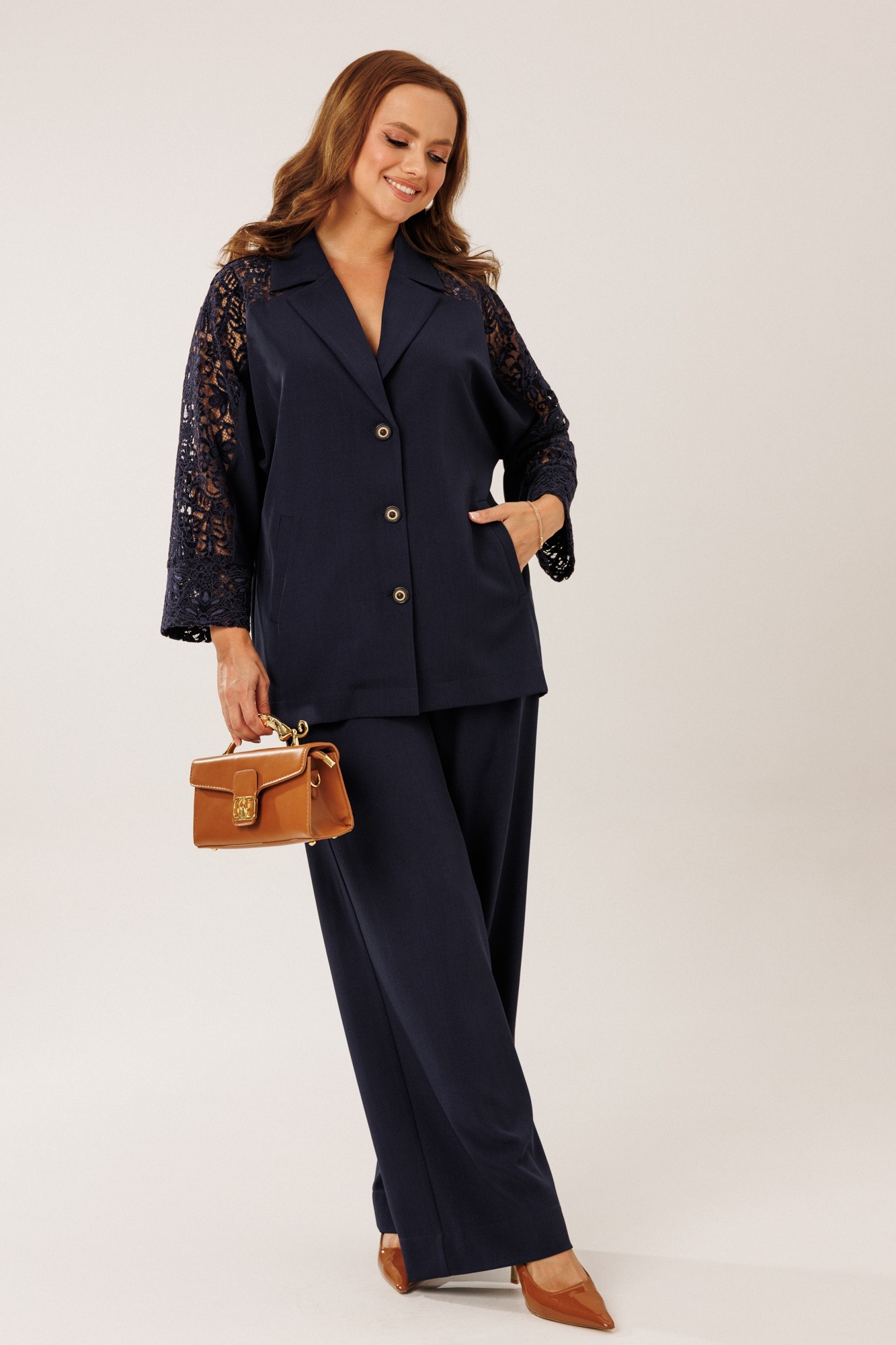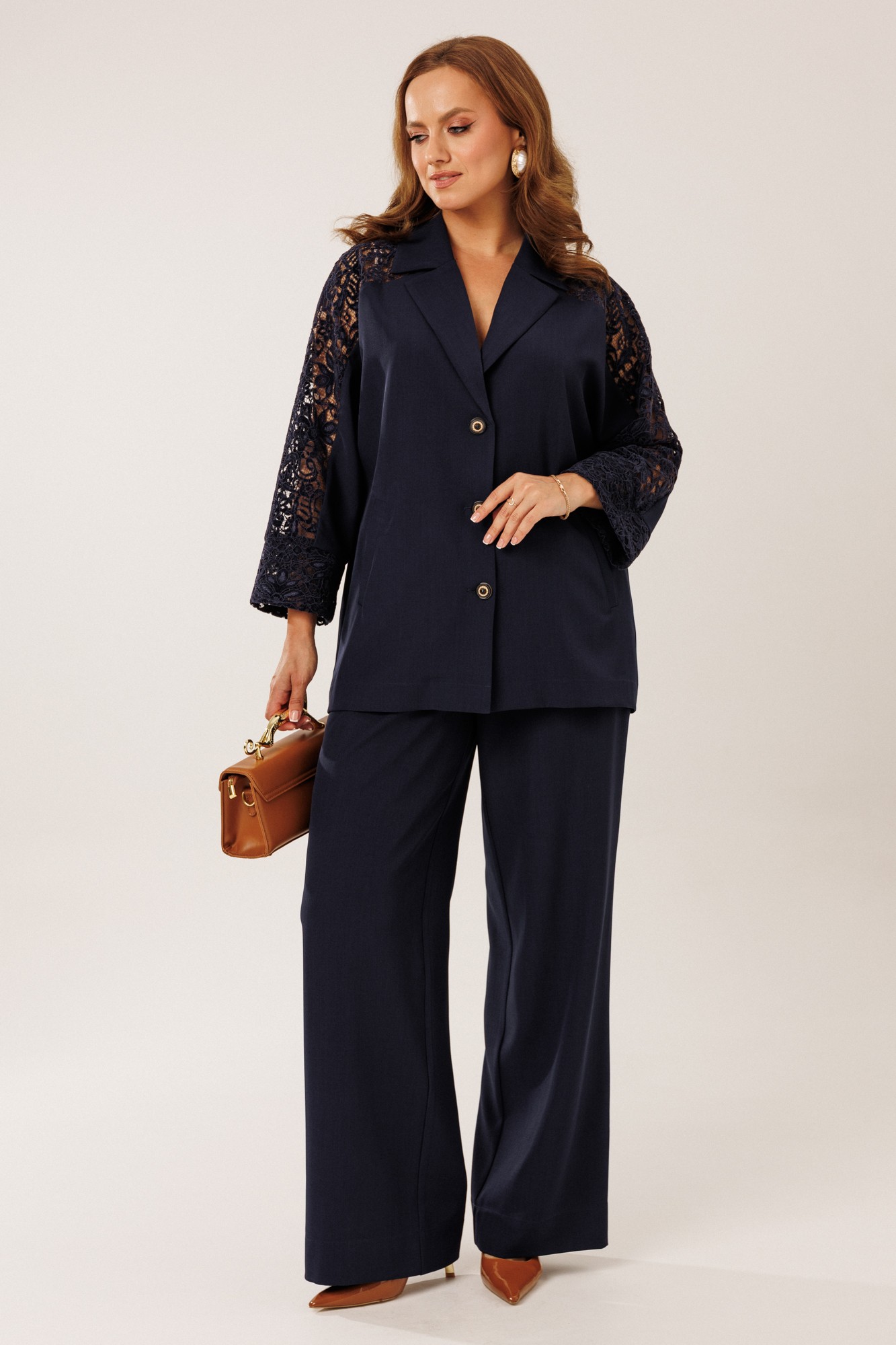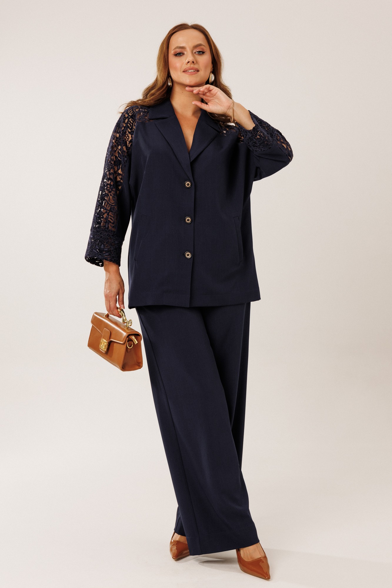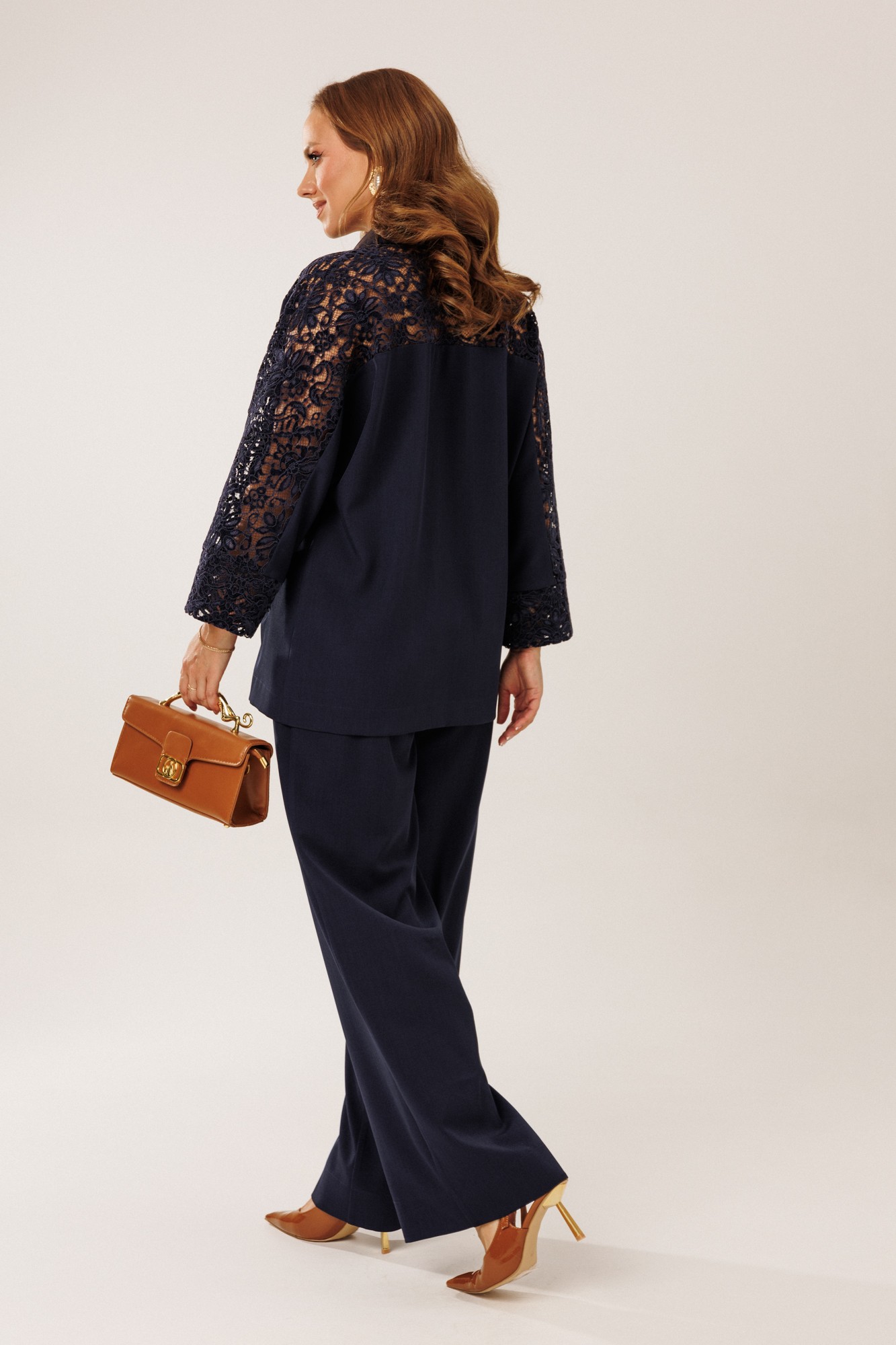 Костюм состоит из жакета с брюками. Жакет однобортный без подкладки, прямого силуэта с цельнокроеными рукавами. На полочках жакета обработаны наклонные прирезные карманы «в рамку» с листочкой. Кокетка полочки переходящая в кокетку спинки и верхнюю часть рукава из набивного гипюра в цвет основной ткани жакета. Манжета рукава так же из набивного гипюра. Спинка жакета прямая. Застежка на декоративные петли пуговицы. Горловина обработана втачным воротником с отрезной стойкой и лацканами. Брюки прямого силуэта от бедра с карманами в боковом шве. На передних половинках брюк заложены по 1 складке. По спинке брюк обработаны вытачки. Подгибка низа широкая. Застежка брюк на «молнию» в гульфике. Пояс брюк отрезной с частичной резинкой по спинке брюк. Цвет материала может отличаться по тону в зависимости от настроек вашего монитора!