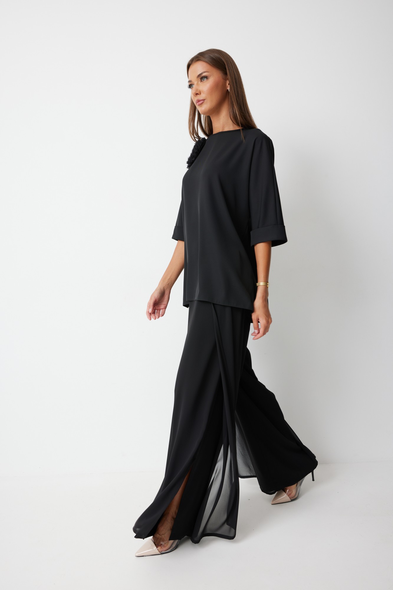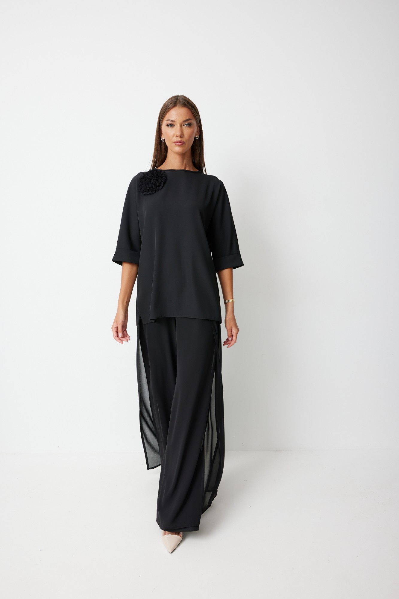 Костюм состоит из блузы и брюк. Блуза женская прямого силуэта закрывающая линию паха с цельнокроеными рукавами. К блузке прилагается съёмный декор – цветок. По боковым швам располагаются разрезы. Спинка с центральным швом и застежкой на навесную петлю и пуговицу. Горловина обработана косой бейкой. Рукав до локтя, низ рукава обработан отрезной отворачивающейся манжетой, закрепленной по швам. Низ блузки обработан швом «в подгибку». Брюки прямого силуэта, выполнены из шифоновой ткани на подкладке полной длинны. Боковой шов брюк открыт. Синка брюк заходит на перед по верхней части. Подкладка из не просвещающейся креповой ткани. Верх брюк обработан отрезным поясом. Центральная часть пояса без резинки, остальной пояс на резинке. Низ брюк обработан швом « в подгибку». Цвет материала может отличаться по тону в зависимости от настроек вашего монитора!.