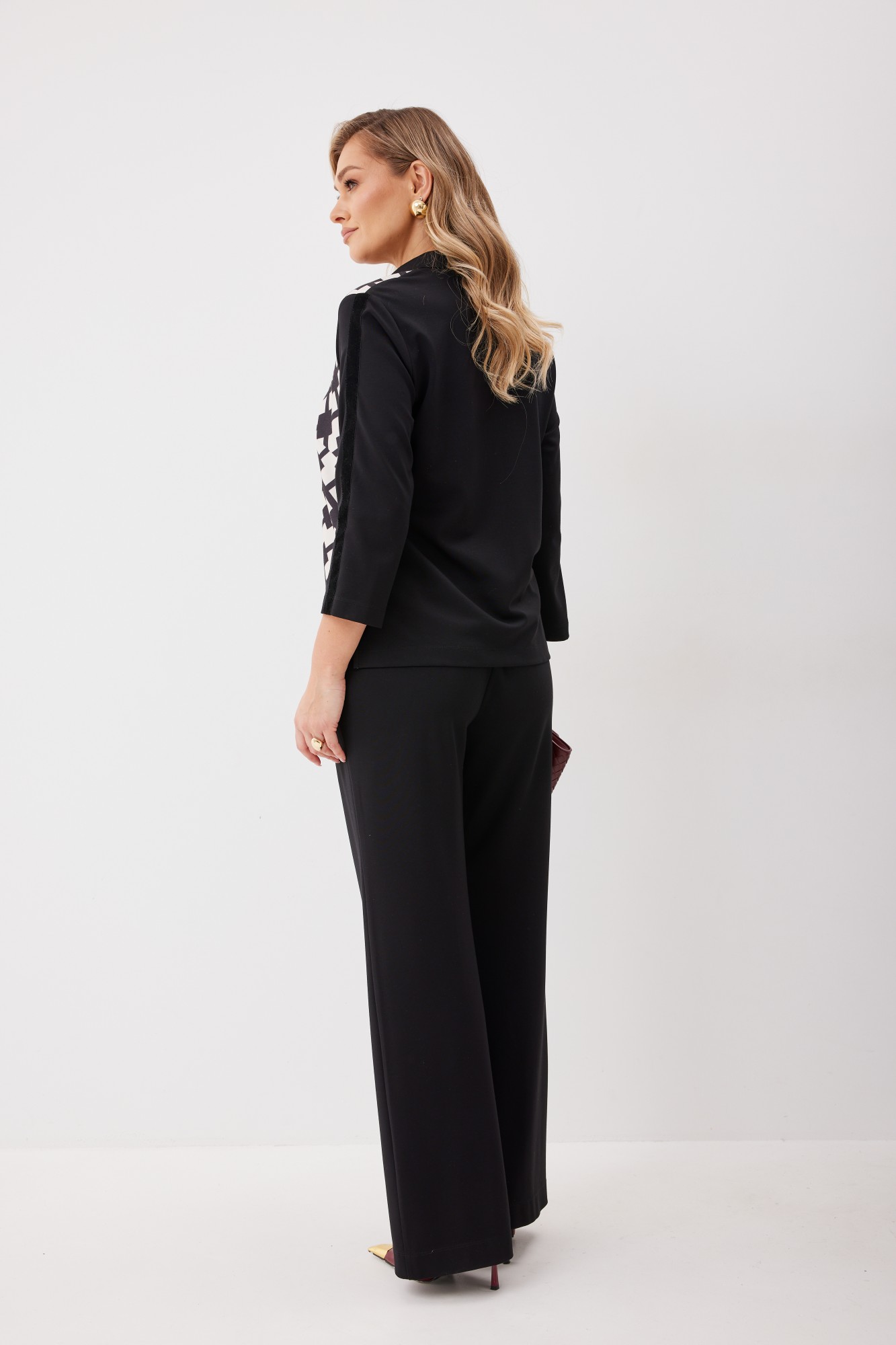 Костюм состоящий из блузы с брюками. Блуза по типу «поло» из трикотажной ткани длиной до середины бедра с застежкой до линии груди. Втачные планки обработаны декоративной тесьмой и застегиваются на кнопки. Перед выполнен из ткани с принтом. По левой половинке выполнен карман обманка с листочкой с декоративной тесьмой и кнопкой. Спинка прямая. Горловина обработана втачным воротником. Рукав ¾ прямой одношовный. На рукавах настрочена декоративная бархатная лента, на правом рукаве с тремя полукольцами. Брюки прямого силуэта из трикотажной ткани с поясом на частичной резинке. По передним половинкам брюк застрочены стрелки и выполнены наклонные карманы с отрезным бочком. Верх кармана декорирован бархатной тесьмой. По передним половинкам отстрочен гульфик (имитация). По спинке брюк застрочены вытачки.