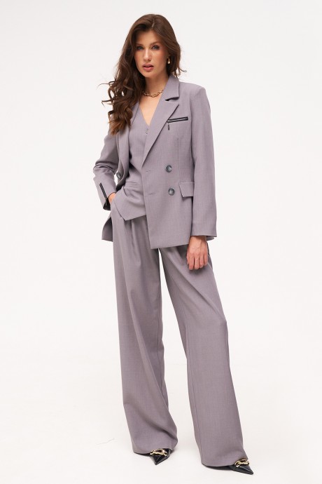 Женский костюм 2-ка, состоящий из жакета и брюк. Двубортный жакет полуприлегающего силуэта с декоративными элементами ввиде молнии со входом в карман на груди и молнией по низу рукава. По переду два настрочных клапана. Сзади шлица. Брюки женские большого объема, прямого силуэта, вида «палаццо». На передних половинках брюк по линии талии заложены две односторонние складки, направленные в сторону бокового шва и функциональные карманы с отрезным бочком. На задних половинках находятся по две талиевые вытачки. Пояс отрезной, притачной, с уступом на правой передней половинке. На поясе шлевки. Верхний край пояса расположен на естественной линии талии. Застежка брюк – классический гульфик. Застежка пояса на две пуговицы и две петли. Длина брюк в пол.