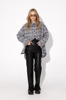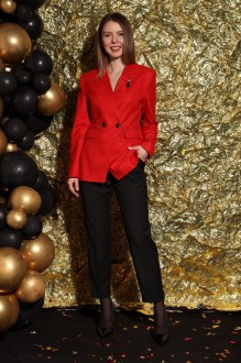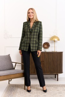 Костюм состоящий из приталенного жакета и брюк. Силуэтный жакет с воротником-стойком плавно переходящим в борта. Застёжка на ряд пуговиц. По переду прорезные карманы в рамку. Рукава со шлицами и пуговицами. Брюки классической посадки с карманами по бокам. По силуэту слегка расклешены.